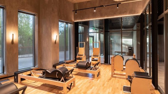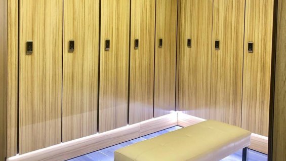 Although the locker rooms in a fitness club are designed dramatically differently, they are united by common lighting.