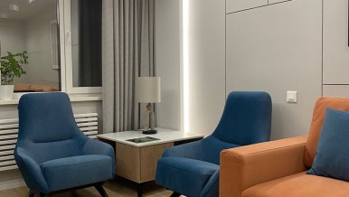 The depth of the living space is created by a contrasting combination of colors and textures: complex velvet blue, sand-wood. Matte white and gray served as a base.
