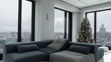 In each room there is a square panoramic window that launches streams of natural light, giving the light design the opportunity to shine. In the kitchen-living room, the line of the built-in track follows the geometry of the windows, and the lamps built into the ceiling merge with it almost imperceptibly.