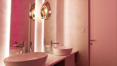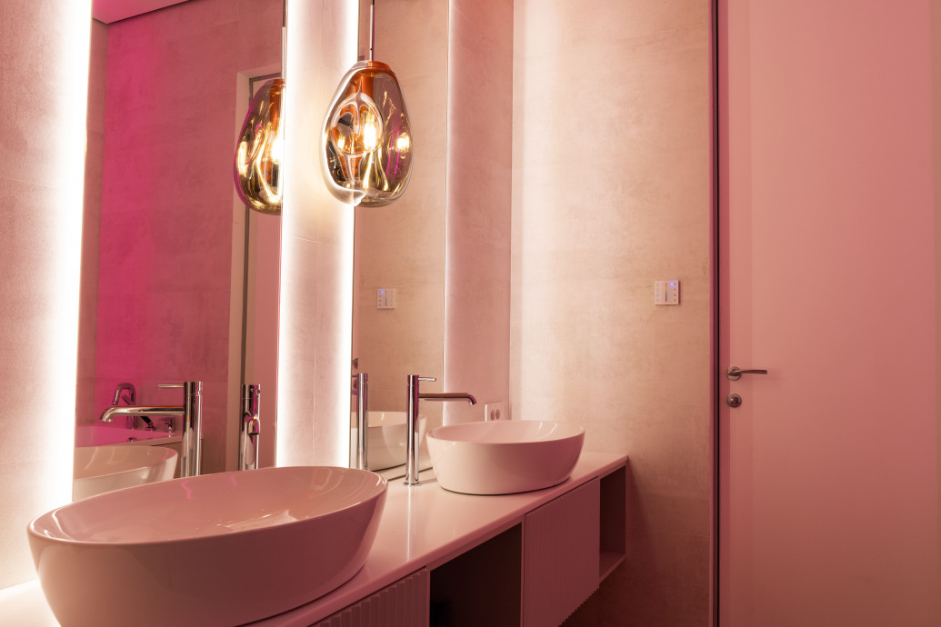 A bright hallway with vertical light lines focuses on the mirrors, giving them height. In the master bedroom, the control of the backlight and light lines will give you the opportunity to create a cozy atmosphere by adjusting each element individually.