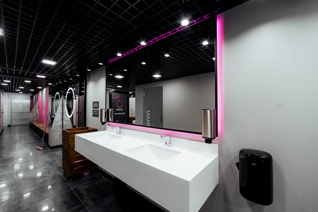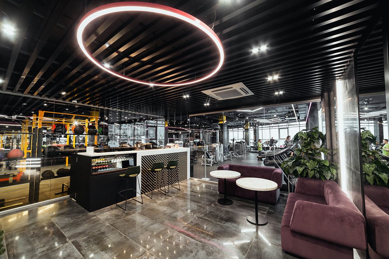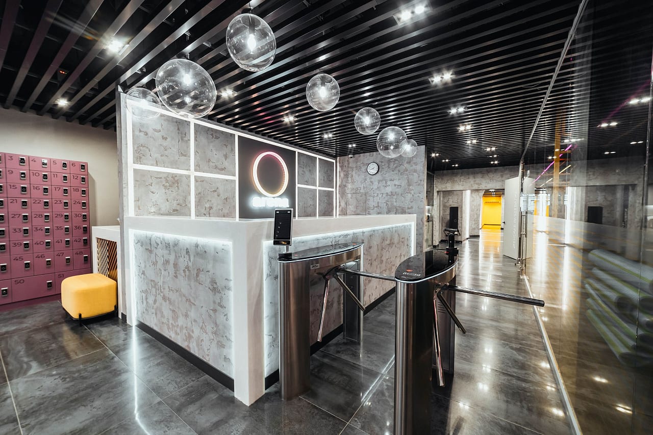 The space of the Arena fitness center in Perm is literally filled with various lighting solutions that emphasize the stylish design and status of the club. Almost monochromatic interior looks winning thanks to a large number of textures and bright color accents, made, among other things, with the help of LED lighting.