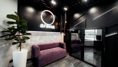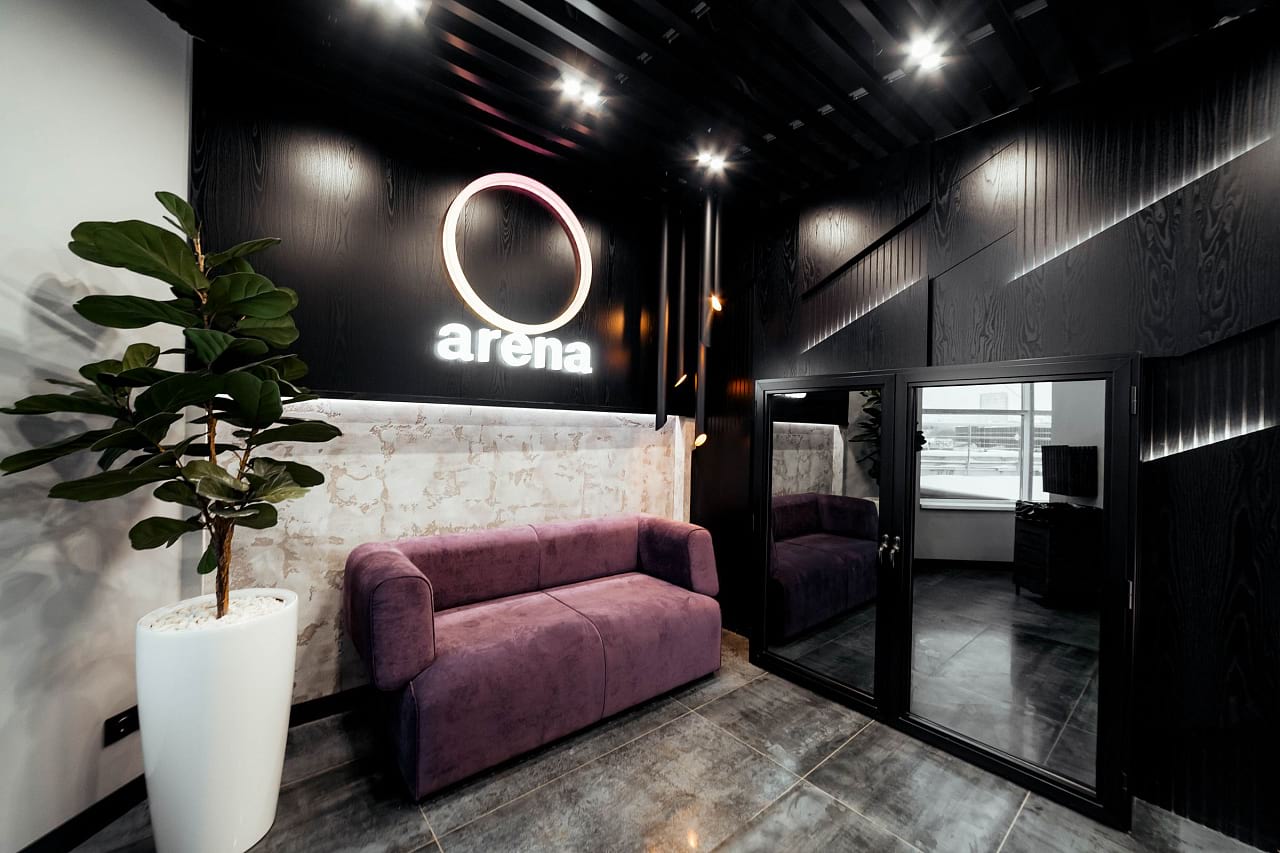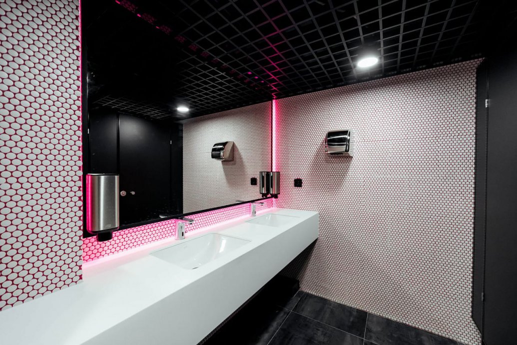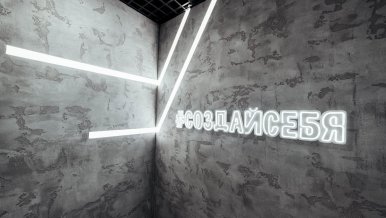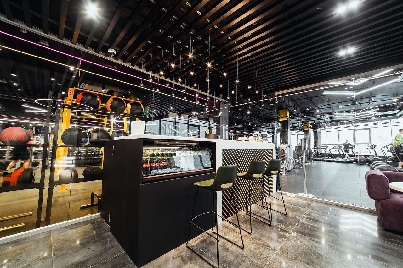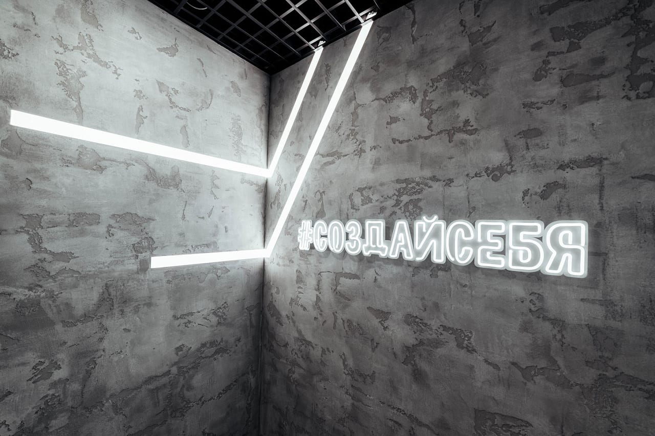 The space of the Arena fitness center in Perm is literally filled with various lighting solutions that emphasize the stylish design and status of the club. Almost monochromatic interior looks winning thanks to a large number of textures and bright color accents, made, among other things, with the help of LED lighting.