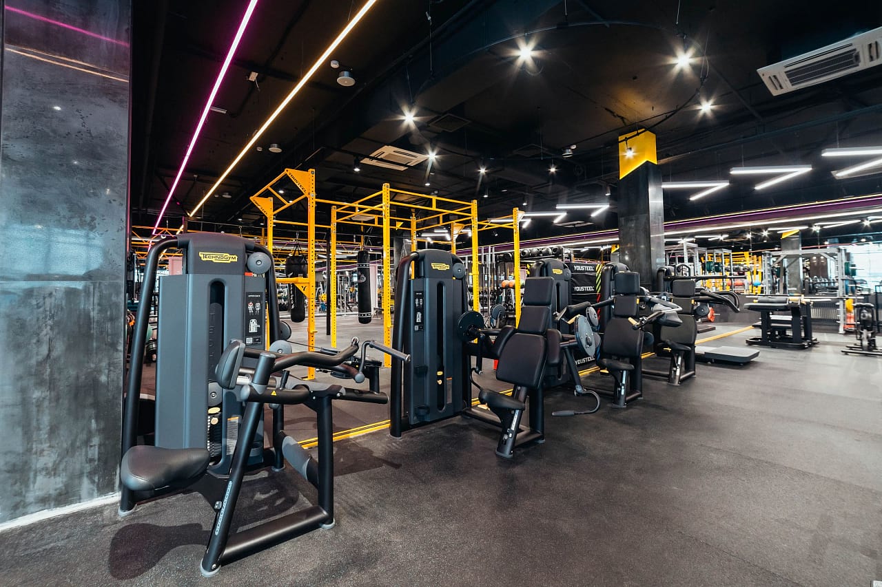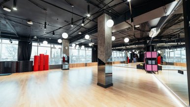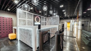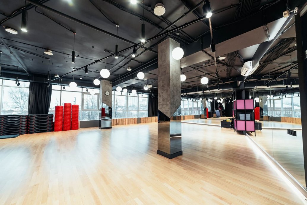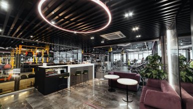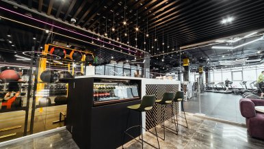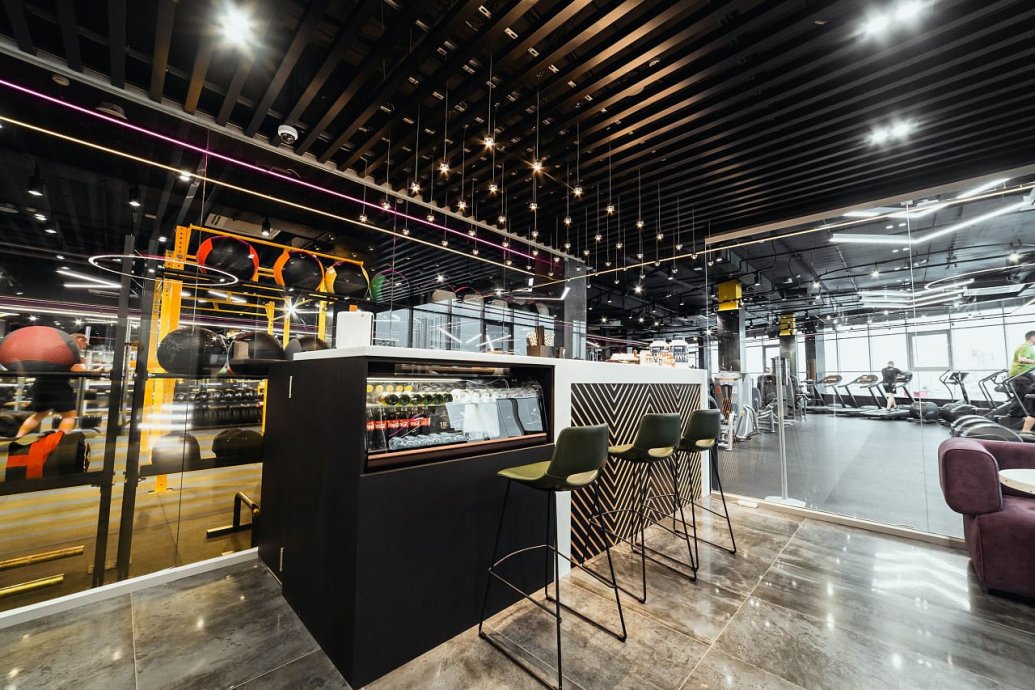 Creative solutions of designers with the help of light and mirrors to change the geometry of the space, made the interiors of the fitness club interesting, attractive and comfortable for its visitors.