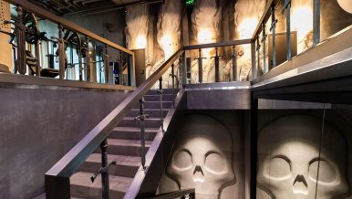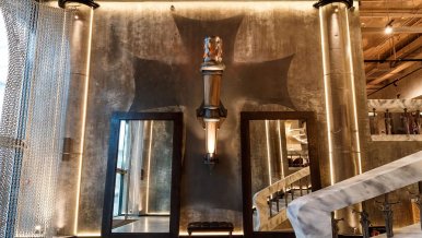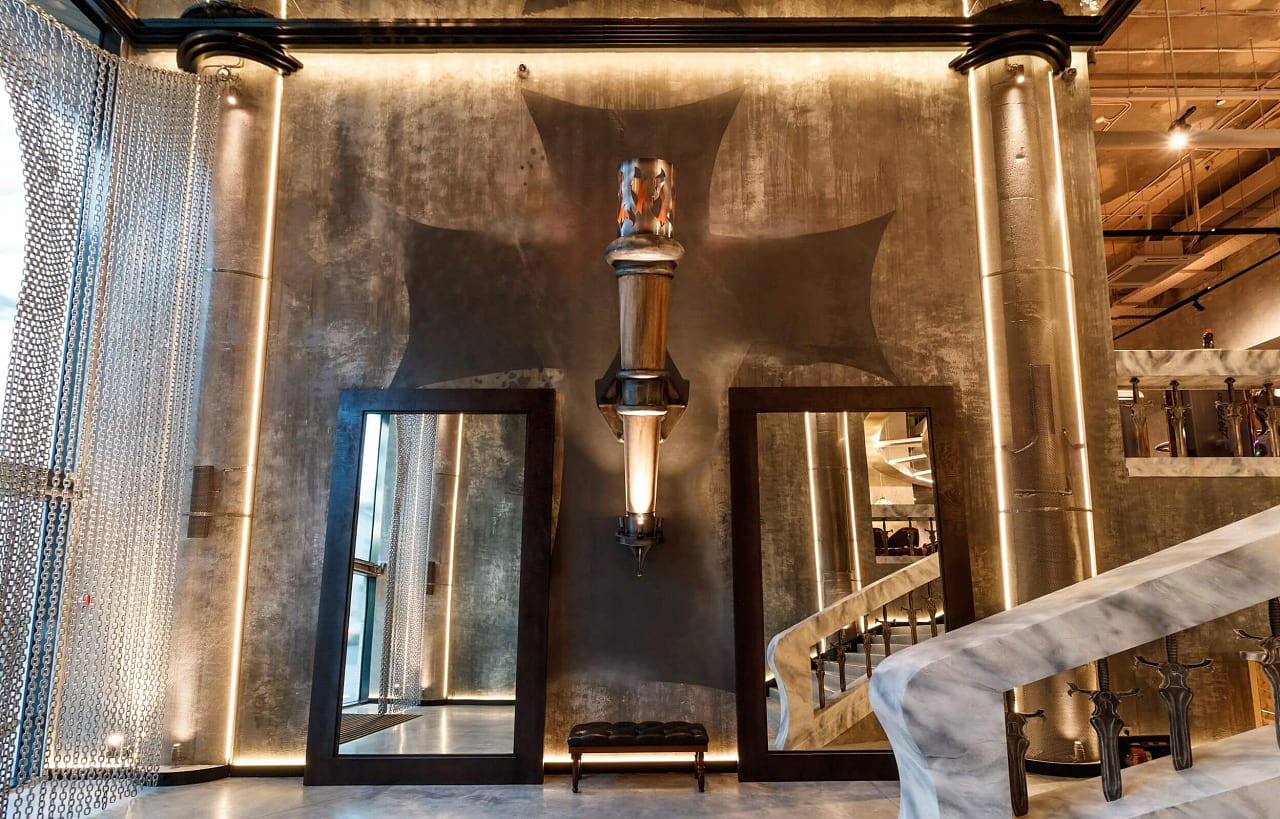 LED lighting is actively used in the project, also exclusively in warm white light. Decorative light strips, soft diffused glow, backlighting - the light source itself is often invisible, visitors are simply immersed in an atmosphere filled with contrasts of warm lighting and brutal, sometimes aggressive interior.