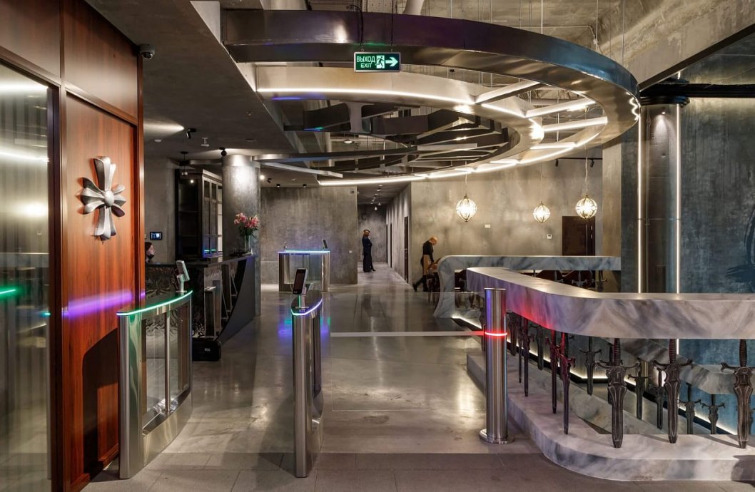 The Anvil Premium Club is a new word in the design of fitness centers in Moscow. World-renowned sports club designer David Barton has created a space that is radically different from other similar interiors. Brutal concrete interior is complemented by unexpected decorative solutions such as balustrades of forged swords, volumetric panels and murals. The atmosphere of the club is emphasized by Arlight lighting.