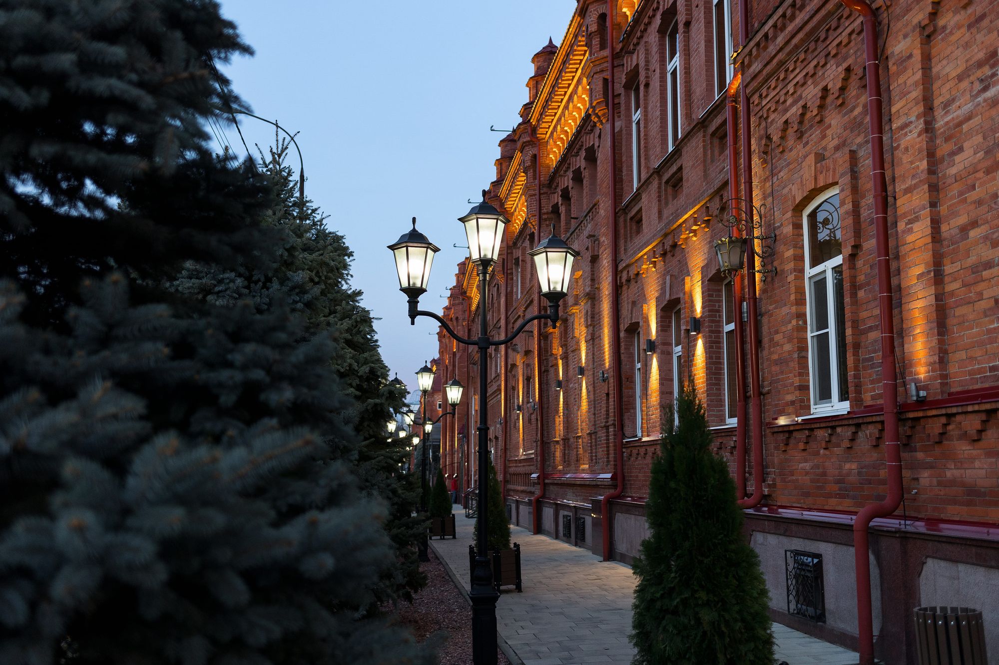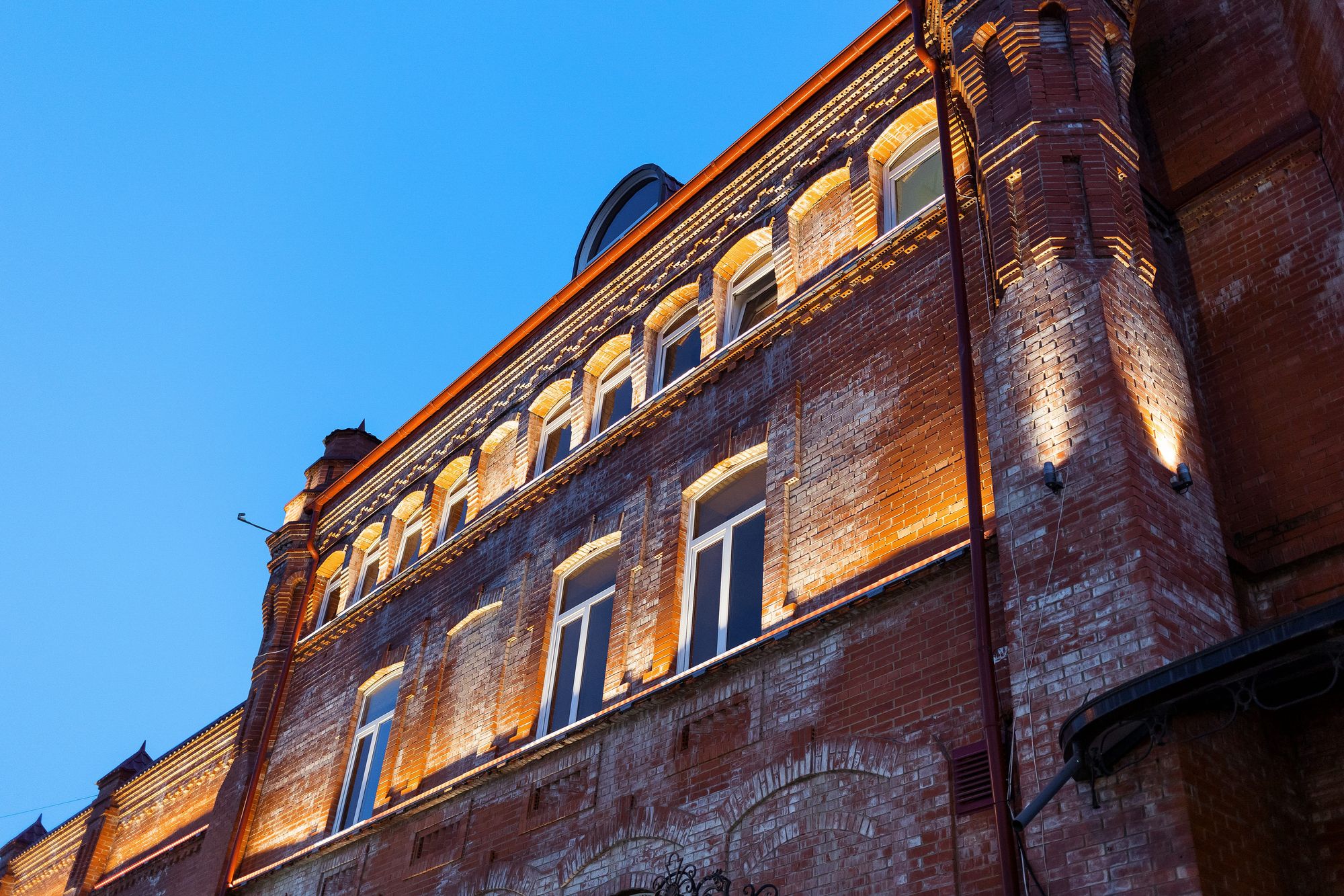 The FORMA-WALL series of luminaires with two-way up-down glow not only emphasizes the brick texture, but also provides ample illumination around the building. LED strips evenly illuminate the building's end and patterned cornices, allowing decorative elements to be highlighted even in the dark.
