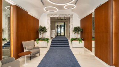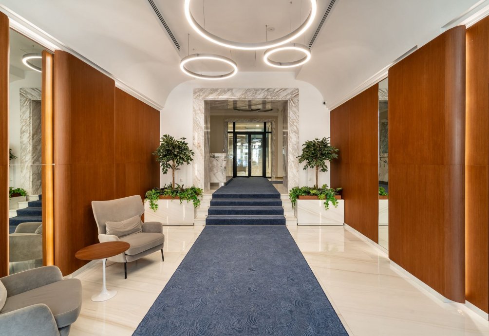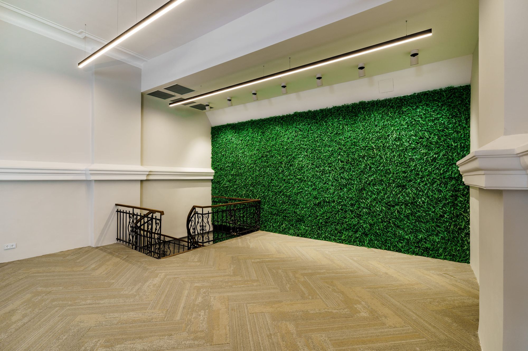 The key light object of the business center is an imitation of a large window located directly in the ceiling. A large area of the “window” is covered with a diffusing screen, behind which mounted LED MIX-tapes with a high degree of color rendering.