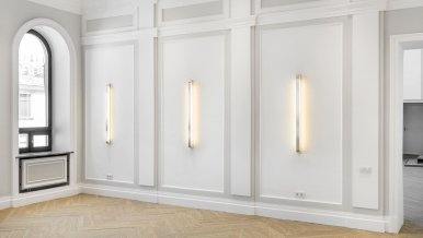 Stylish wall decoration with a glossy shine is emphasized by light accents of warm white glow. This interesting effect is based on the harmony of contrasts. The soft, diffused contour light gives the rooms a visual weightlessness and transparency.