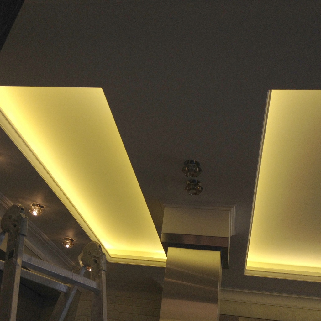 In the house there is both monochrome backlighting and multicolor. For example, in the kitchen and in the children's room used RGB-tape Arlight. In all other rooms more classic version of backlighting white warm glow. The same LED strip illuminates the niches around the TV zone.