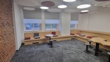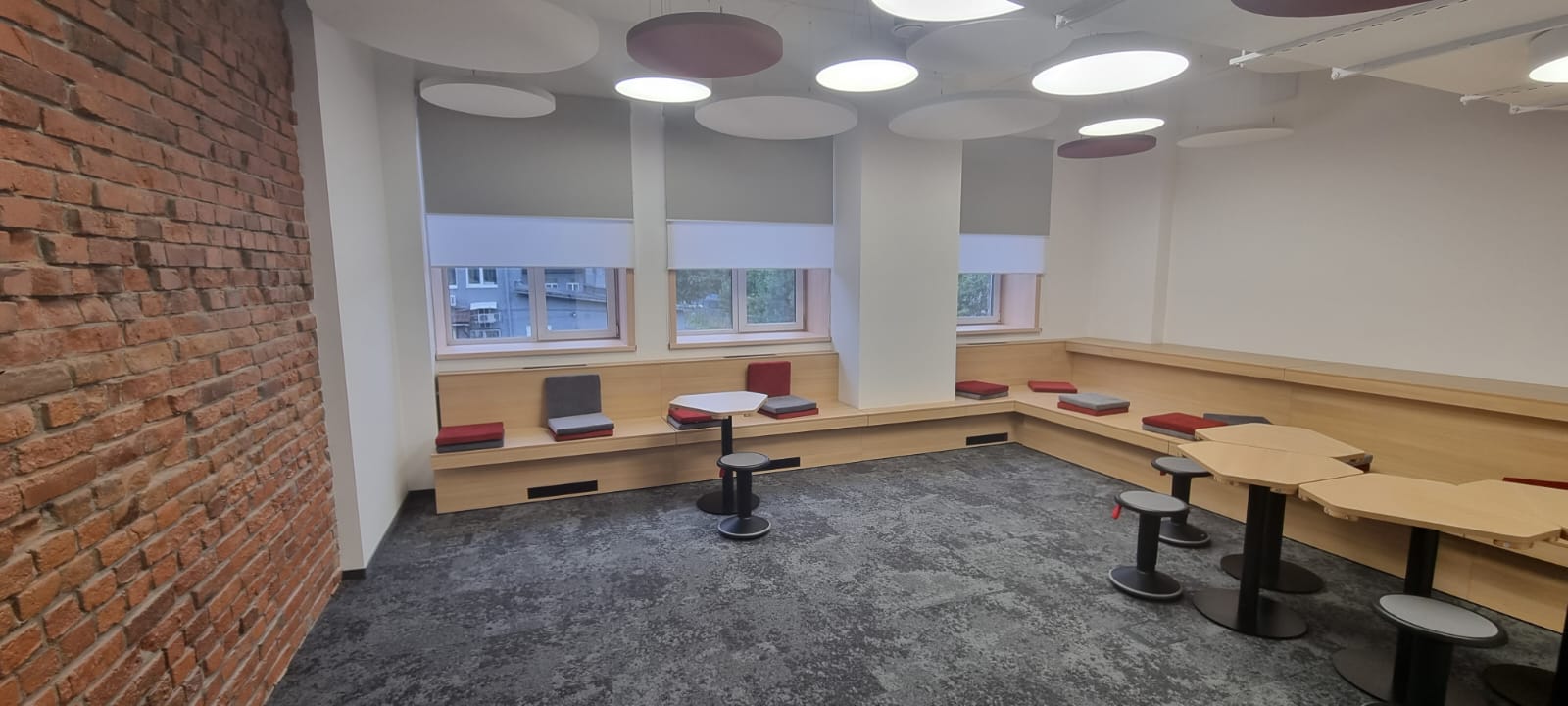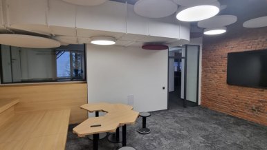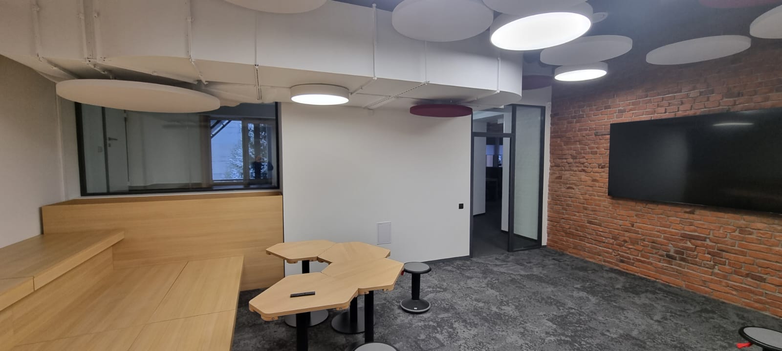 In the meeting room, employees can get inspiration directly from the ceiling! The combination of round luminaires from the TOR series in various diameters with decorative elements creates a light and relaxed atmosphere in this room.