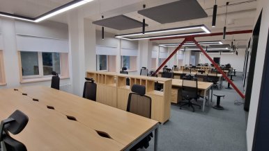 Modern stylish office is organized in open space format. Workplaces of employees are illuminated by rectangular areas of light lines, which repeat the shape of desks. Geometricity of the office is emphasized by broken lines of burgundy partitions.