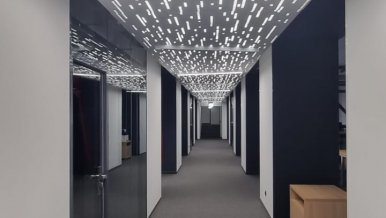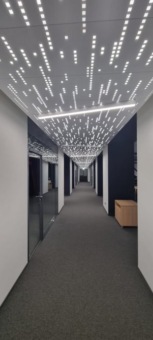 Particularly impressive is the ceiling in the corridor, where the luminous elements resemble a code line. Despite its originality, this solution is not enough for general lighting, so the ceiling is also equipped with surface-mounted linear luminaires. RT series tapes and profiles with screens and accessories with screen SL-LINE, SL-ROUND are used for the light lines.