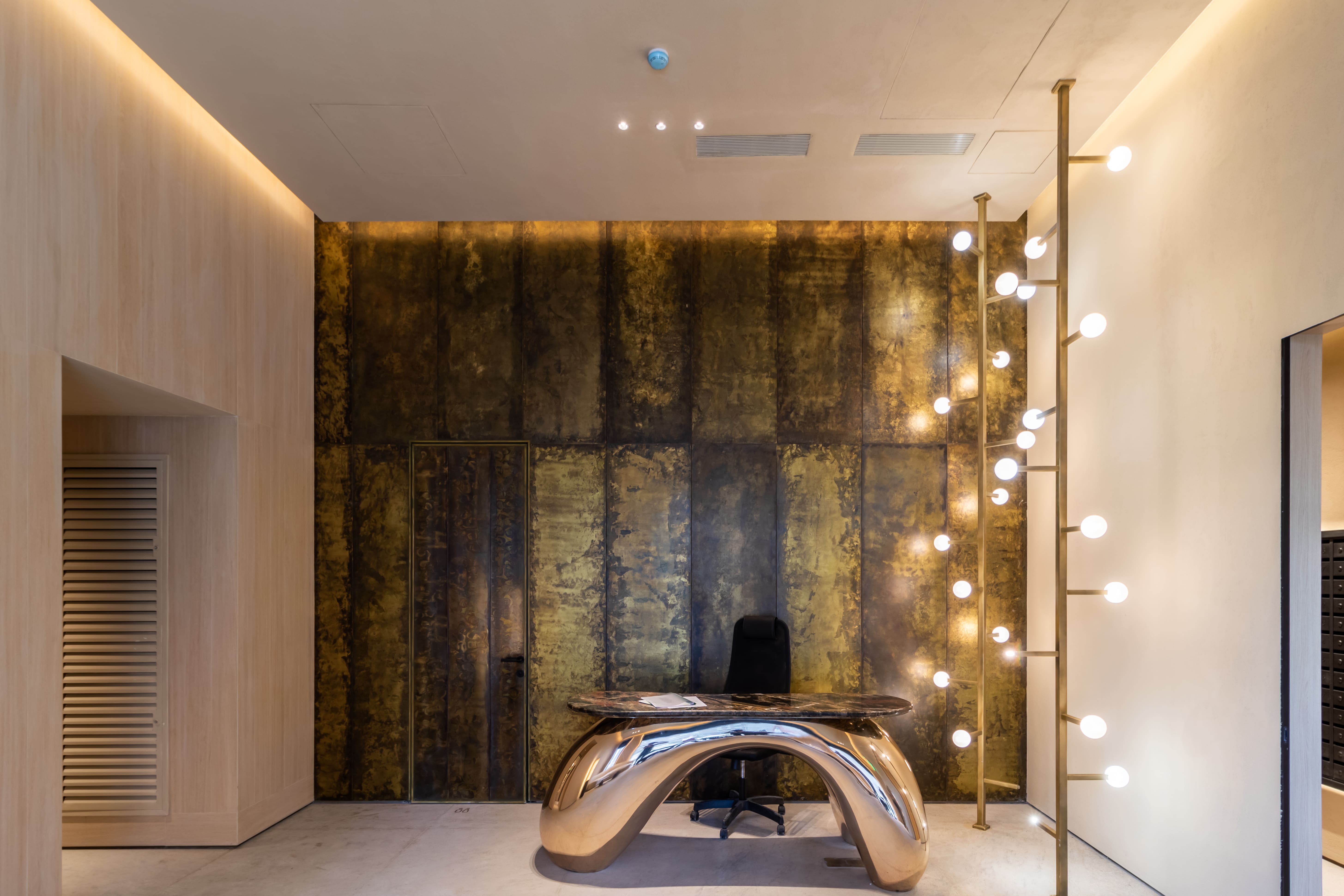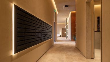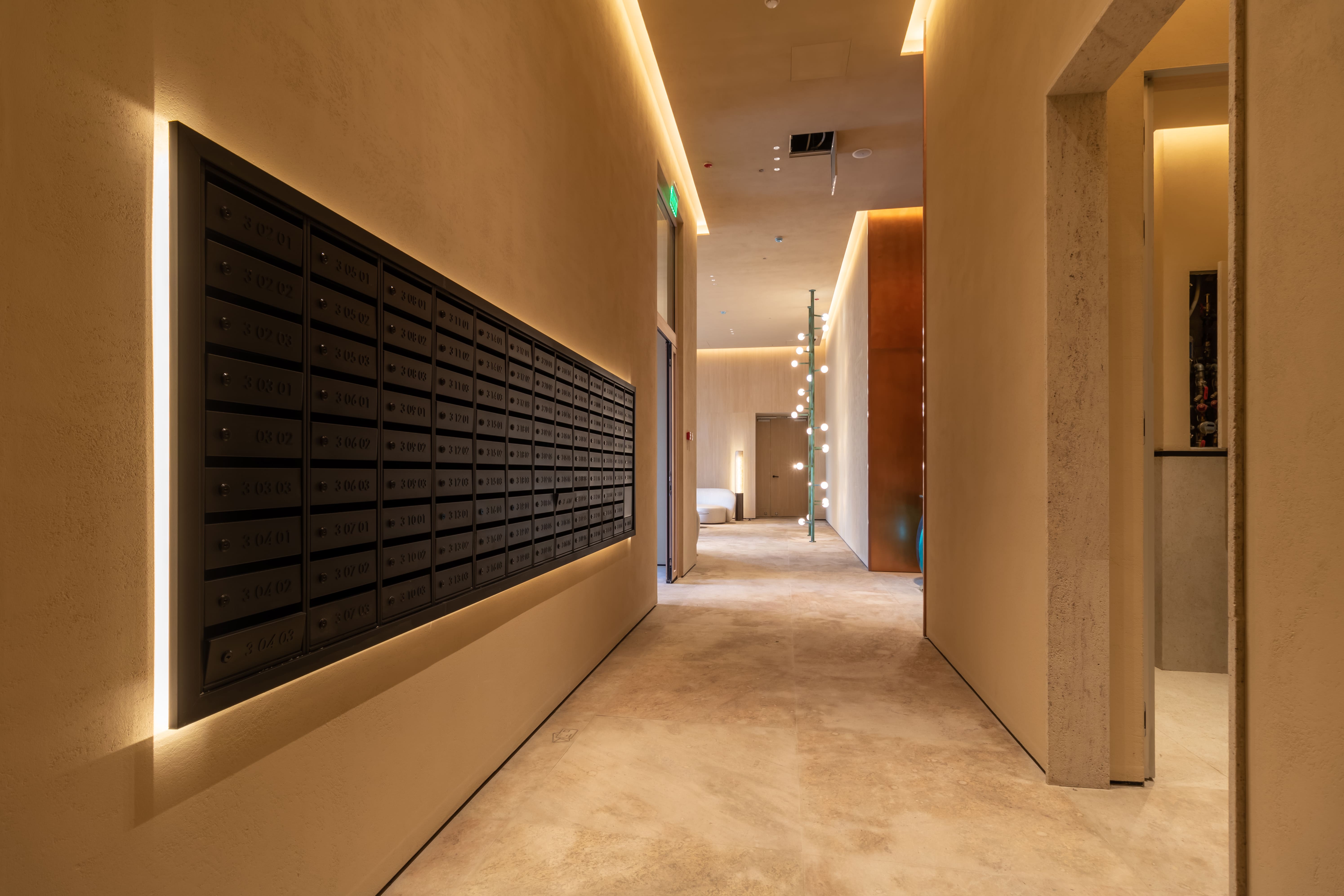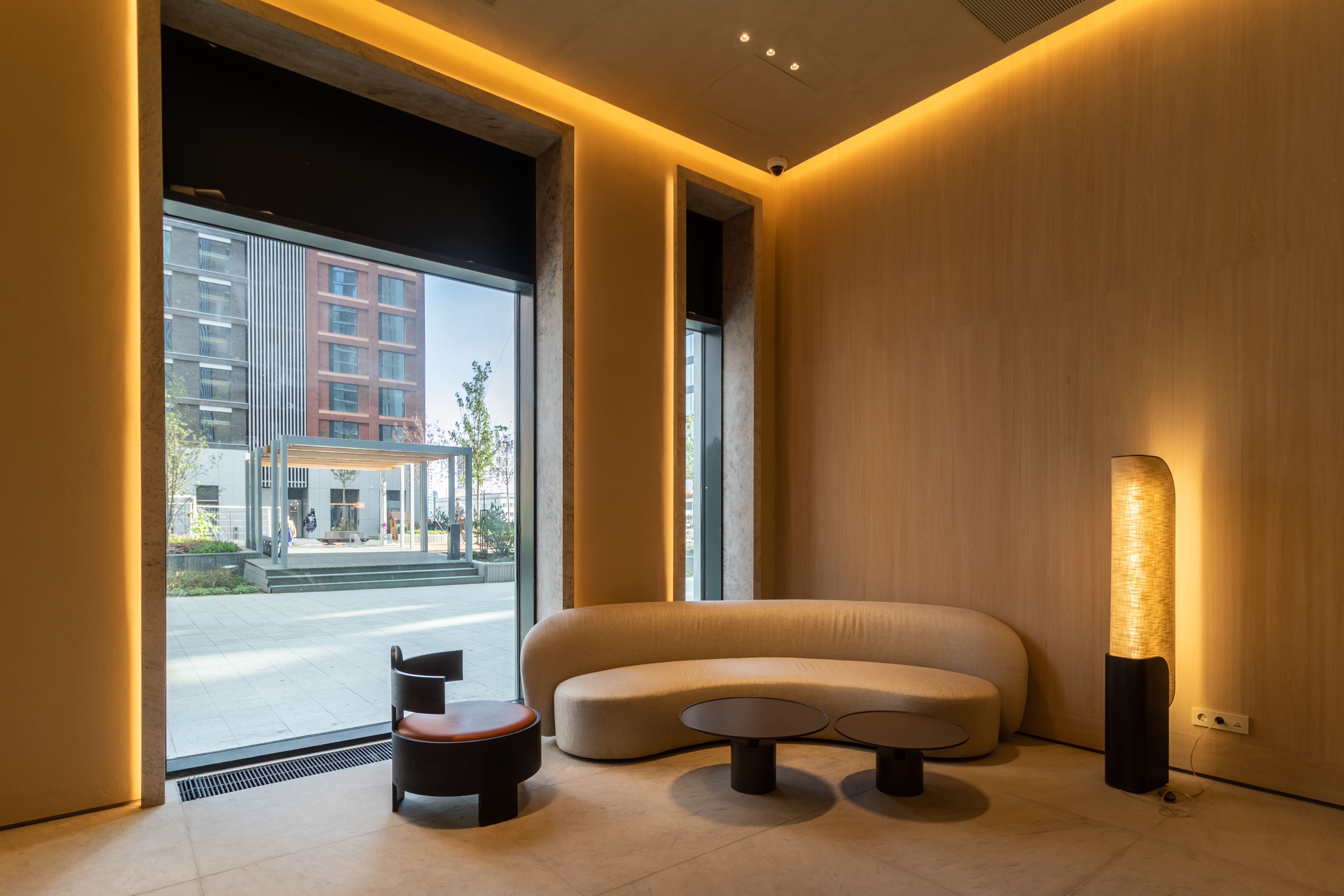The lobby of the residential complex is decorated in the colors of autumn, noble, peaceful and relaxing. Lighting in warm shades of glow enhances this effect, gives the interior some luxary.
