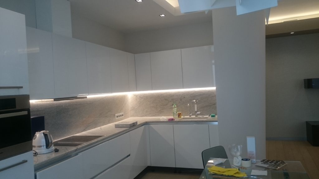 Functional lighting in this apartment is represented by several types. Lighting in the kitchen is an important part of it. Backlighting under the hanging cabinets in the kitchen is made to illuminate the working area: LED profile is installed in the corner between the wall and the hanging cabinet. A strip is mounted in the profile, which is then covered with a matte diffusing screen. In this area is organized contactless light control. Thanks to the motion sensor installed in the profile, it is enough to put your hand near the sensor area to turn the light on or off. This smart control is very convenient in the working area of the kitchen, where hands are often busy when cooking.