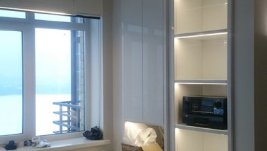 The third type is the illumination of the cabinet. LED strip is installed on the shelves. Soft backlighting emphasizes the texture of interior items placed in the closet, and just helps to quickly find the right thing.