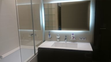 Mirror lighting was installed in the bathroom. LED tape is glued to the back of the mirror, so it acquired a luminous contour, not hitting the eyes.