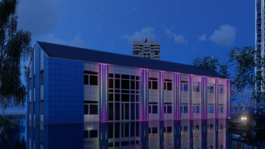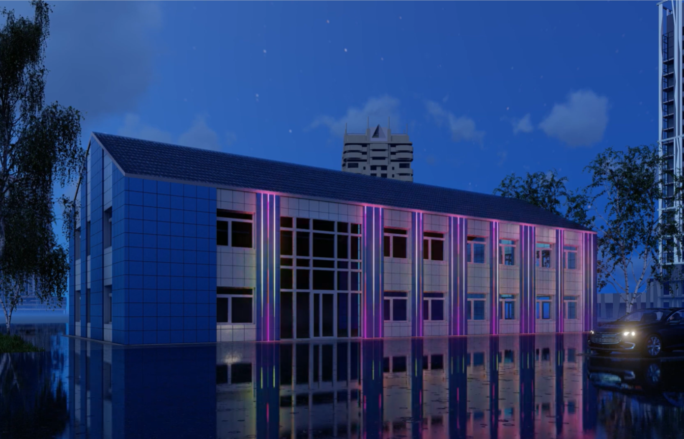 A rather trivial building can be transformed by lighting with dynamic effects. Thanks to vertical lines of light created from sealed flexible MOONLIGHT neon, a small two-storey building acquires a clear contour and becomes visually taller. The upward and downward movement of light along the contours creates dynamics and adds airiness.