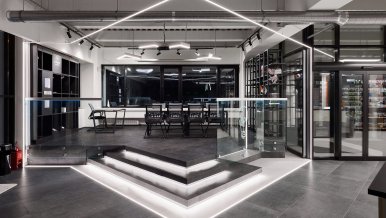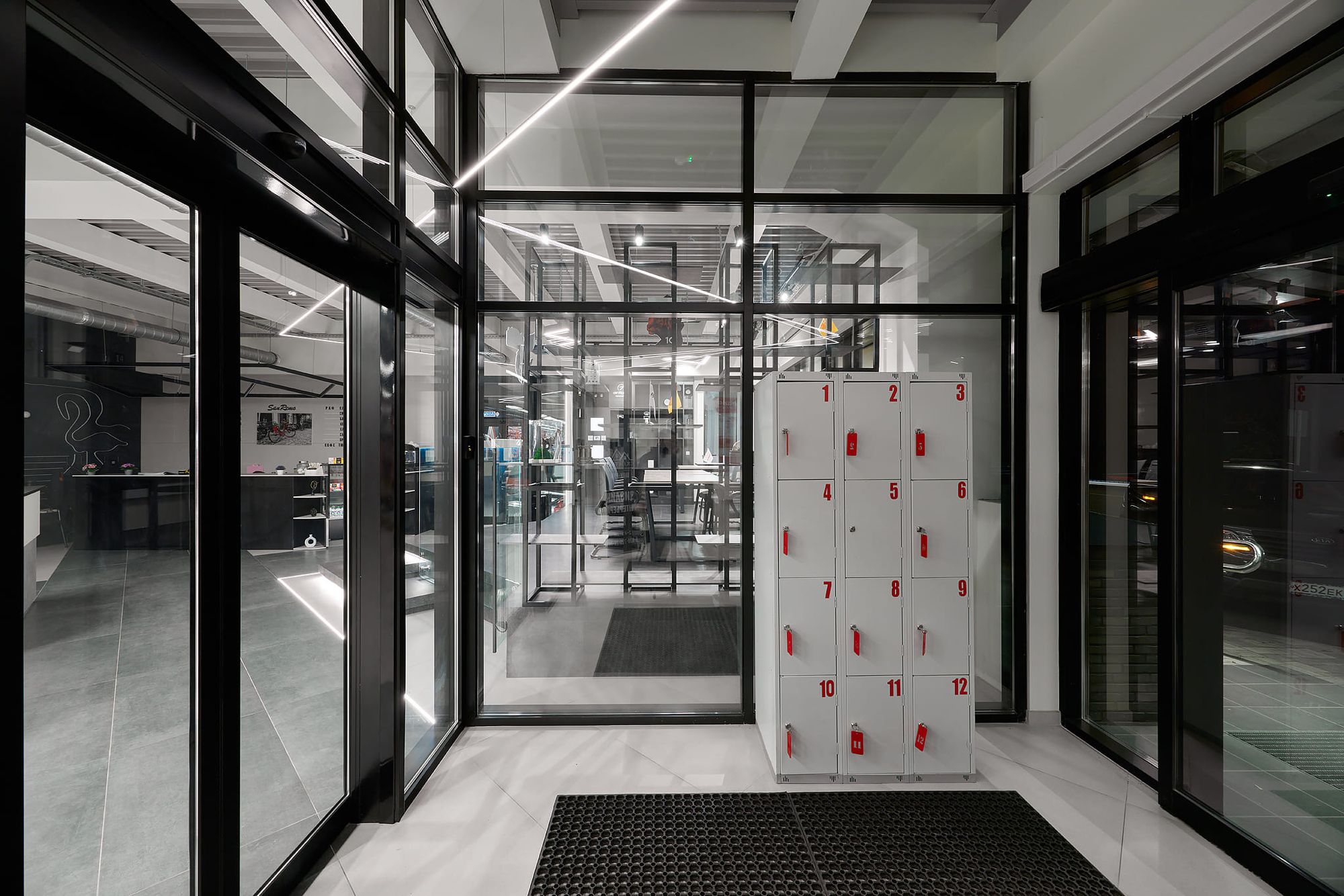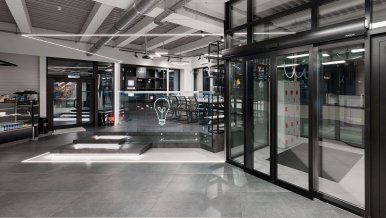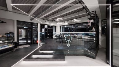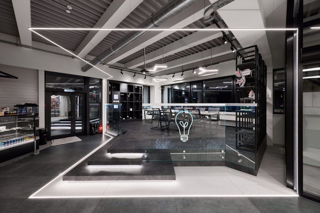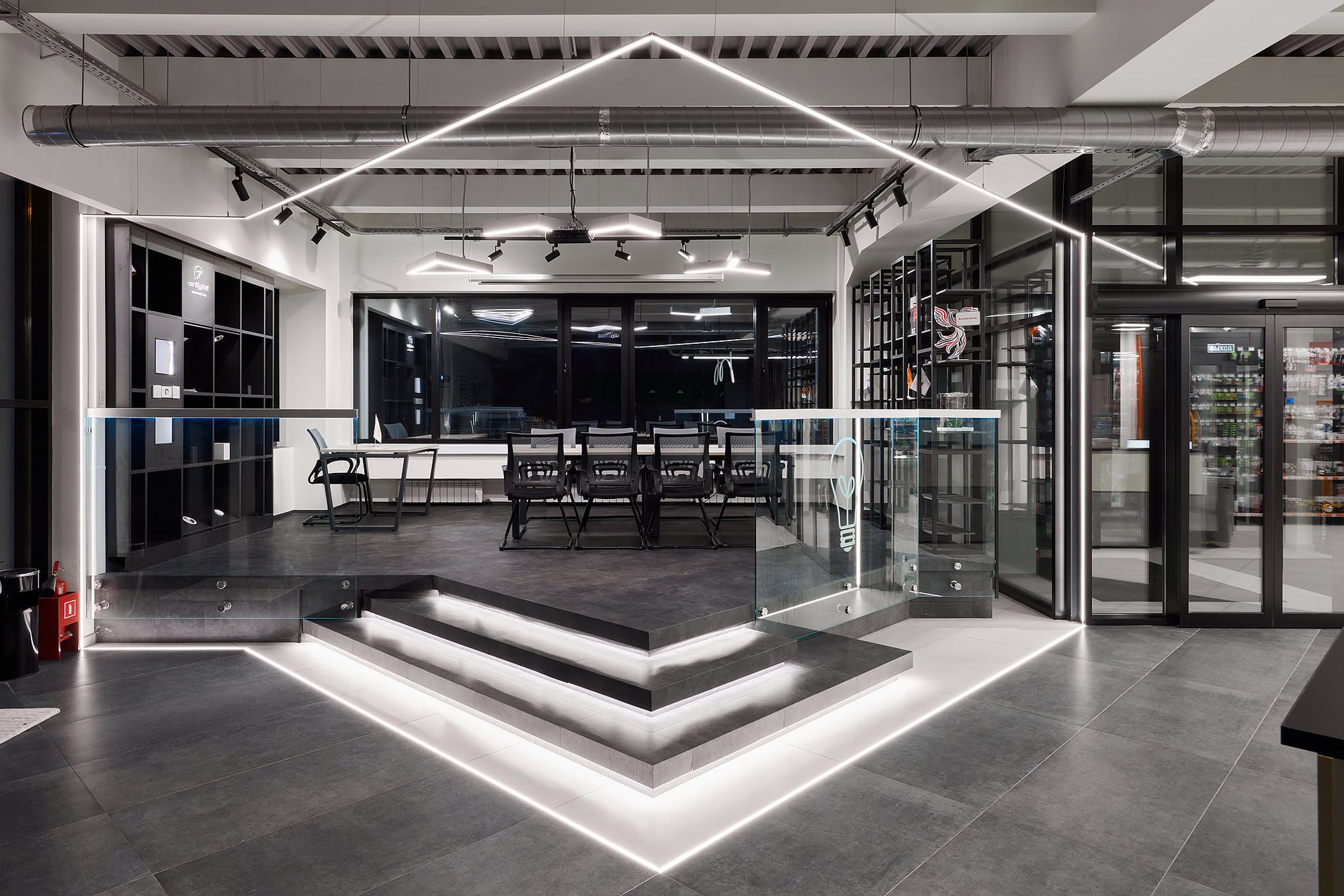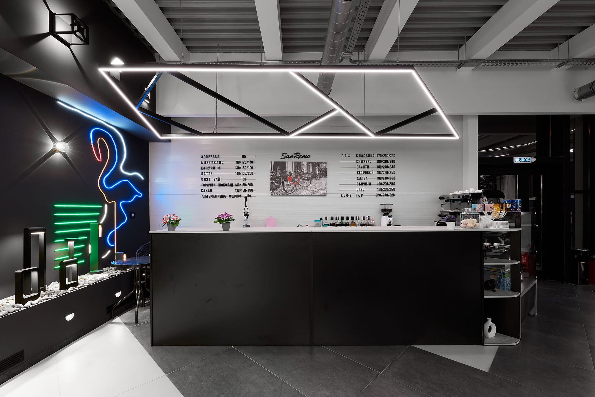 In the cafe and co-working area unique multi-piece suspended compositions of light lines were installed. They not only create a special atmosphere and perfectly match the minimalistic interior, but also show customers all the possibilities of electrical products, which is especially important for a store of this specialization.