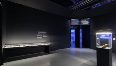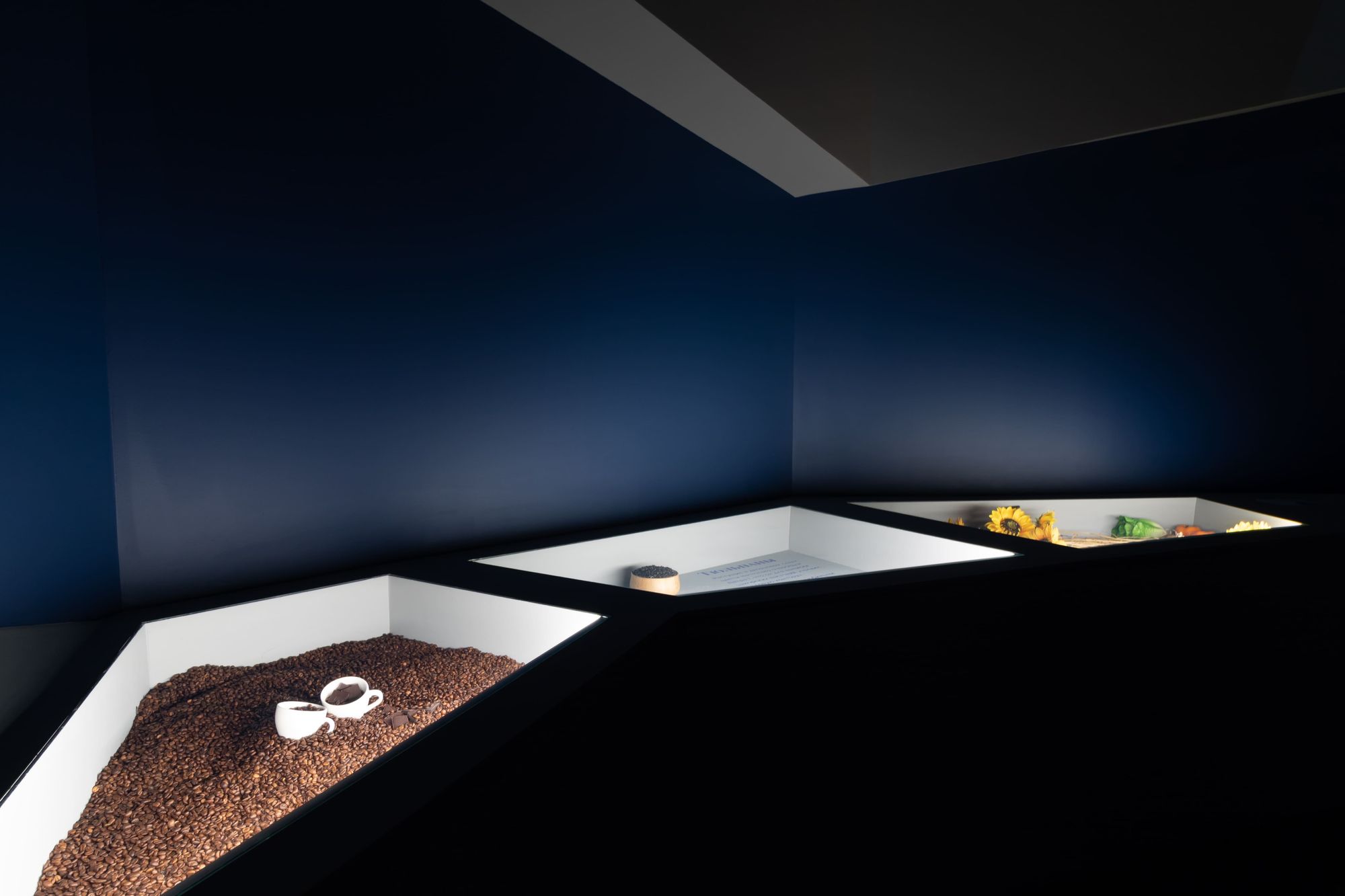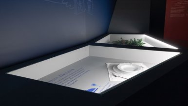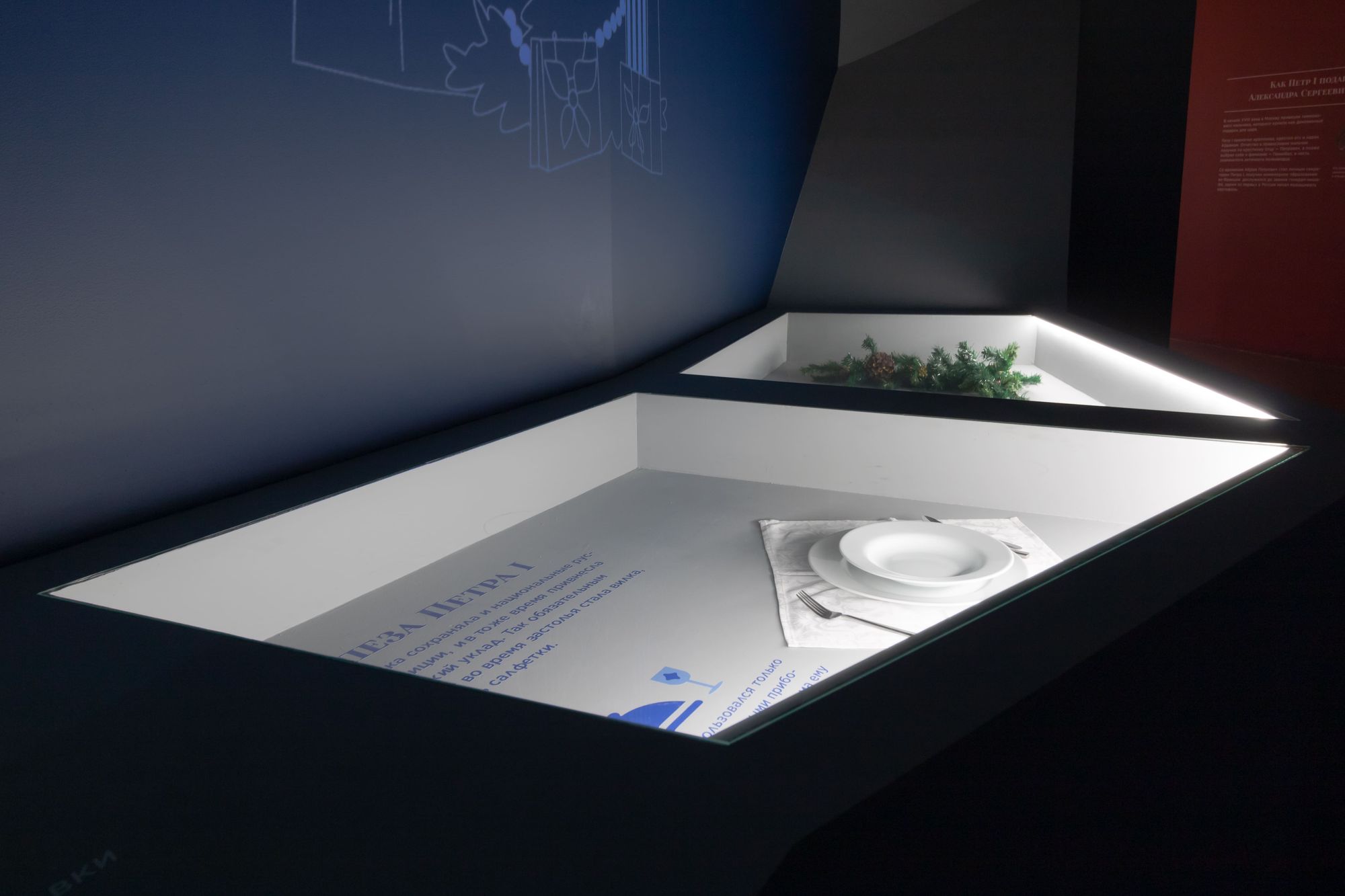LED strips of white and blue light colors are also used in the design of the halls. Diametric illumination creates an interesting effect, helps visitors to navigate in space, drawing attention to the key elements of the exposition. Lightboxes are also illuminated with LED strips, which provides a uniform soft glow, in which the explanatory texts to the exhibits can be easily perceived.