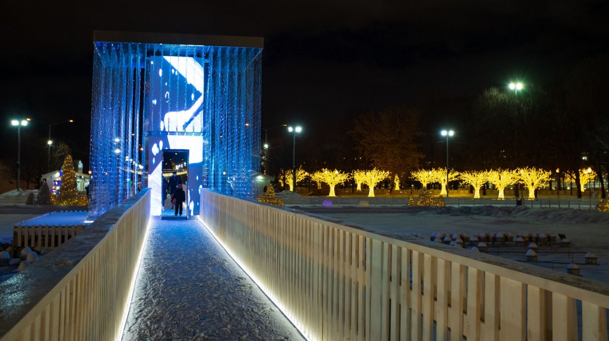 Mirrored skating rink in Moscow's famous Gorky Park. Gorky Park in Moscow's famous Gorky Park strikes the imagination of visitors with its enchanting light structure: the curtain arch consists of 287 ARD-STRING LED garlands.