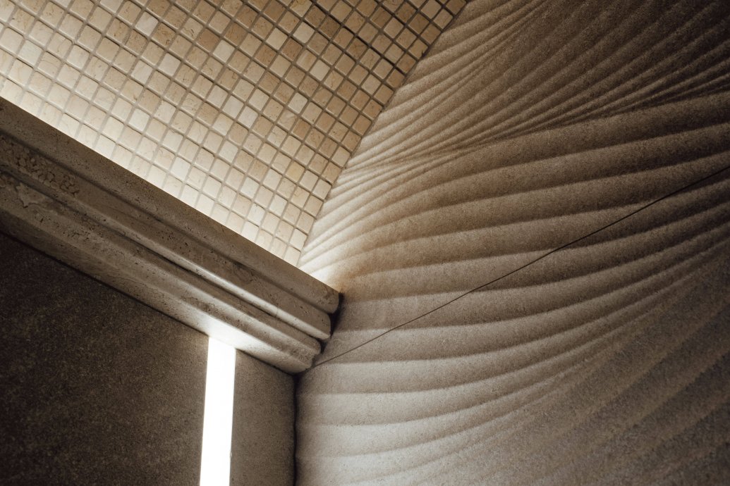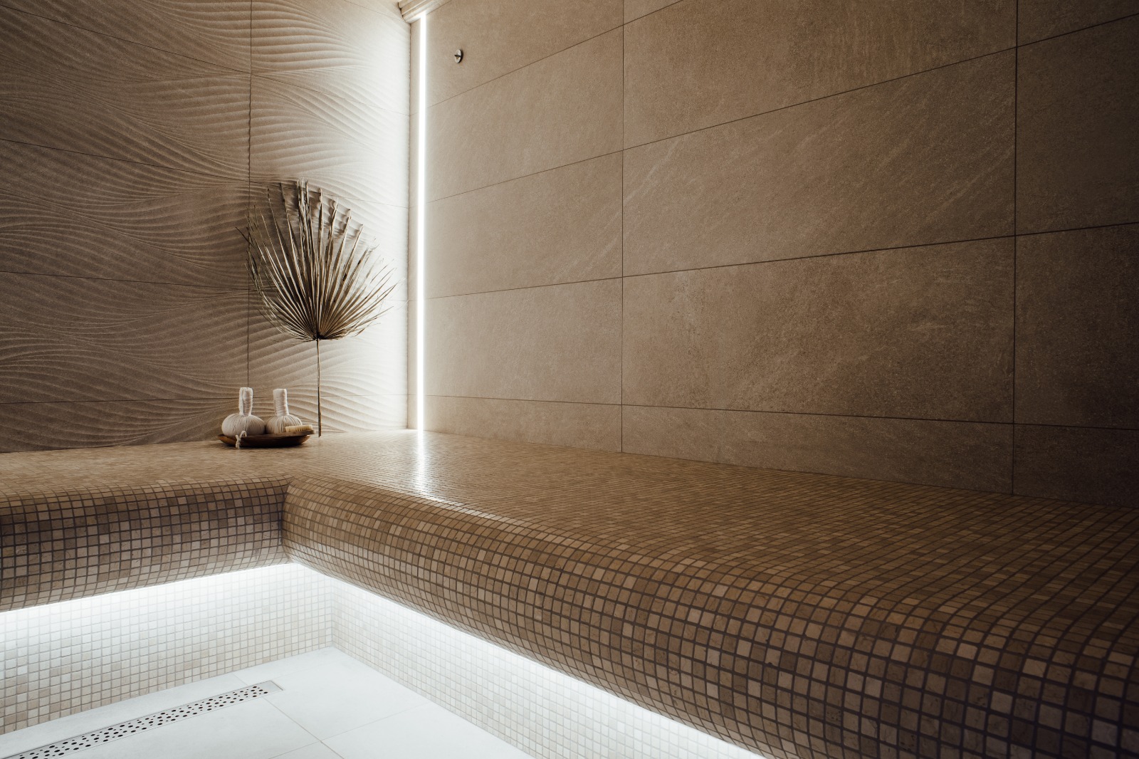 A relaxing atmosphere of calm, unhurriedness and peace reigns in the hammam thanks to the pastel shades of the interior. At the same time, the interior does not look simple. It is made rich by various textures: fine mosaics on the ceiling surfaces and benches, smoothness of polished marble and relief of slabs on the walls.