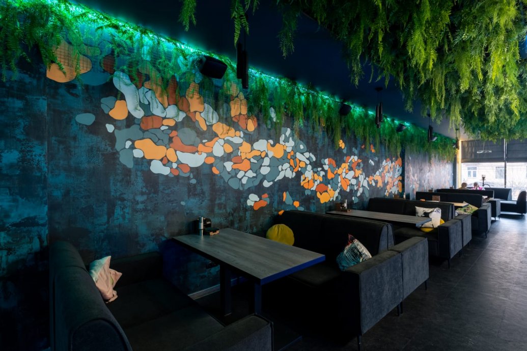 Facility's interior is made in dark colors, which creates a feeling of coziness and privacy. The feeling of merging with nature is provided by a large number of hanging ferns on the ceiling and walls. The colored lighting of the hookah bar adds lightness, liveliness and somewhat fantastic atmosphere. Abstract colored composition on the wall and RGB lighting also set a relaxing informal tone.