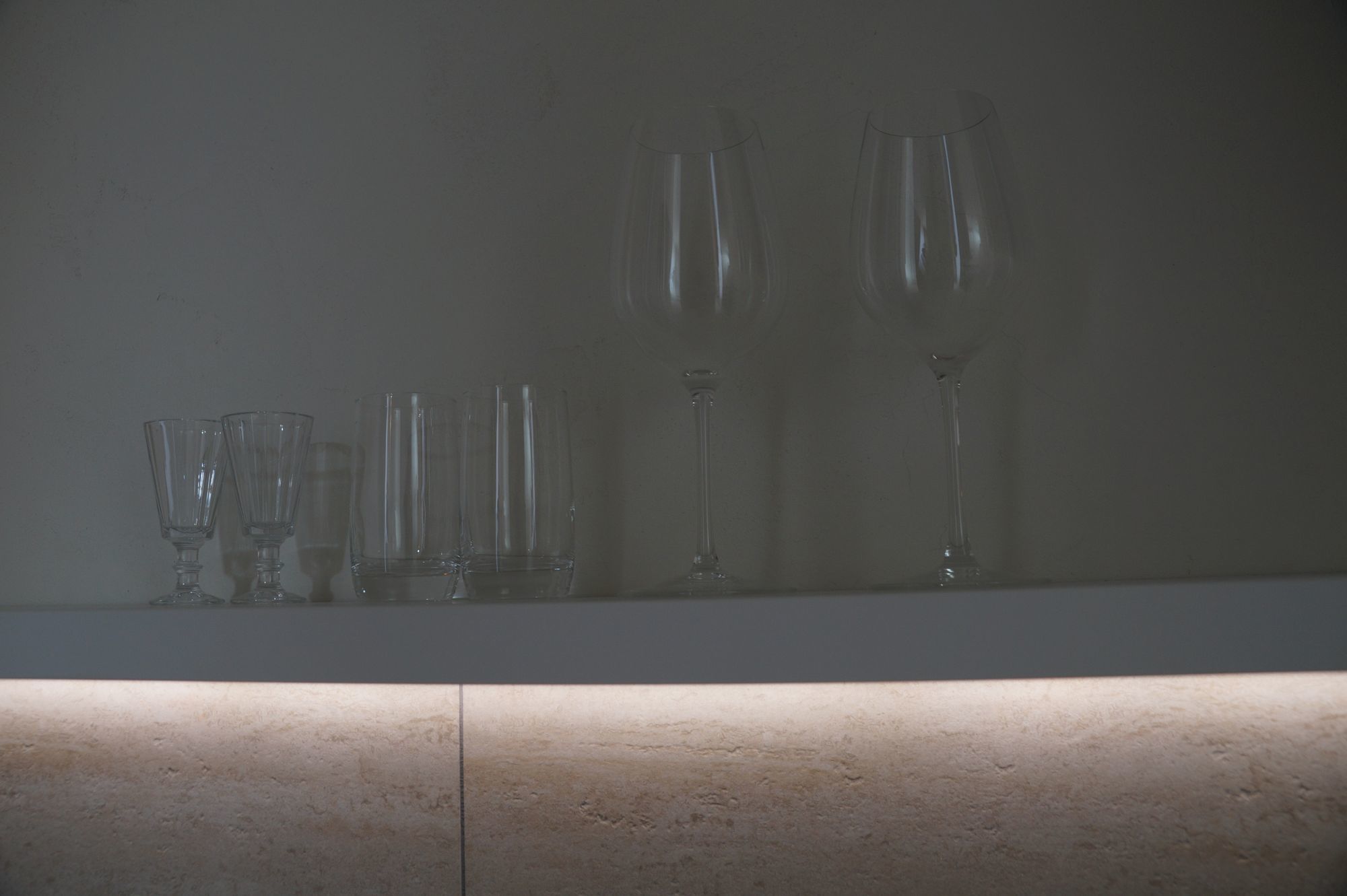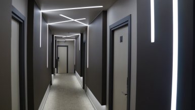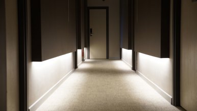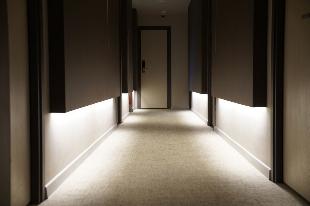 Corridor lighting has two modes. Lines of light from the ceiling to the walls provide the main lighting. At times when main lighting is not required, such as at night, only the lighting above the baseboard can be left on to provide navigation for guests and staff and save energy.