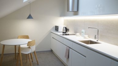 In front of the hotel entrance is a staircase that is illuminated on the sides with a warm glow. This illumination harmoniously combines with the general light flow coming from the chandelier, setting the direction of movement and at the same time creating a cozy atmosphere.