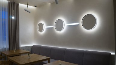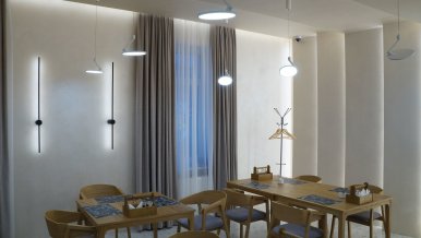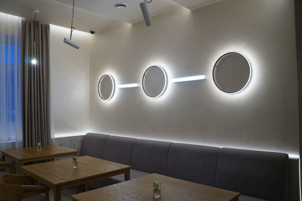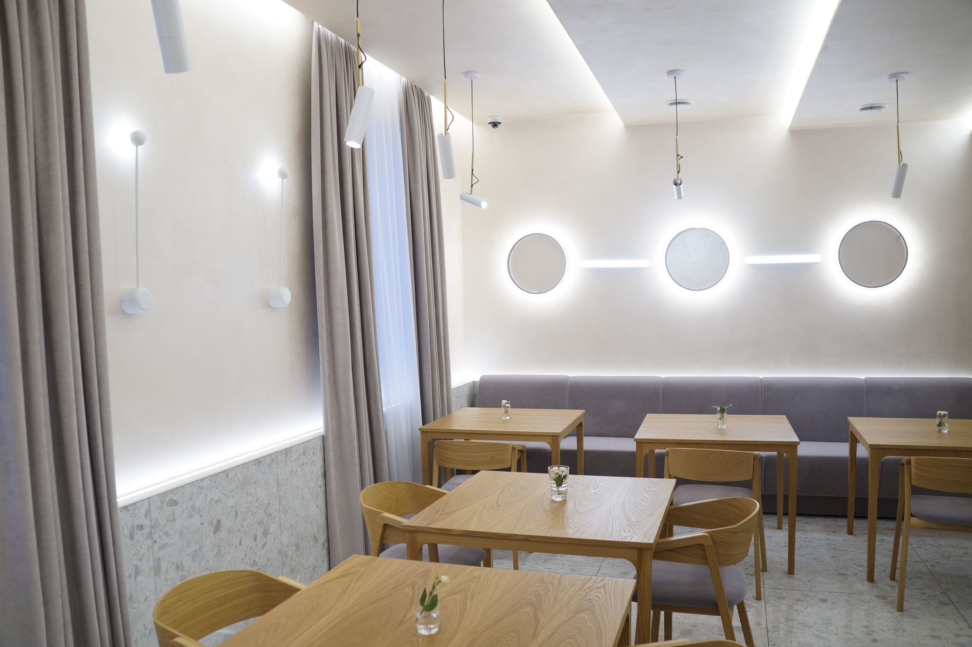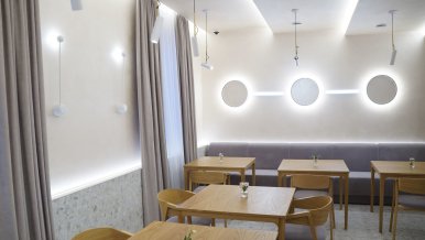 The hotel café uses a bright combination of various lighting fixtures, which gives the space life and spontaneity. Pendant and wall lamps of different shapes and models are perfectly combined with curtain lighting.