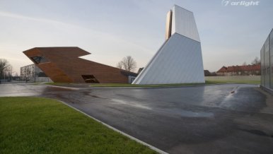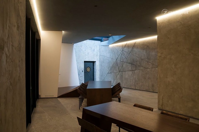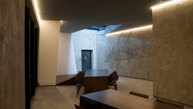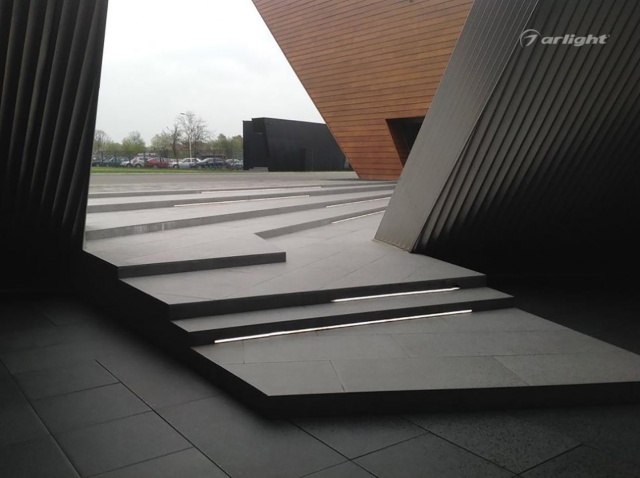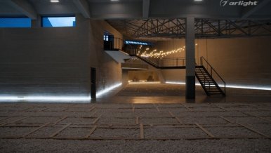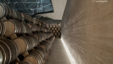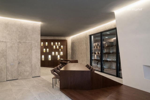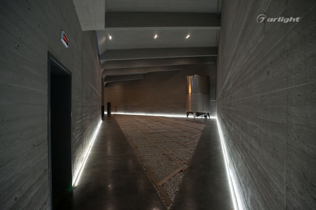 LED lighting plays an important decorative role in the modern building of the cognac factory's storage museum. Both outside and inside, in the most different rooms you can find light accents: from small laconic spots to entire installations of pendant lights.