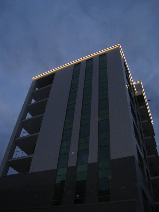 To protect against atmospheric influences: rain, snow, dust and others - the profile has a screen that covers the LED strip. To avoid moisture ingress through small cracks, all joints and holes have been sealed. Power supply units for LED strips were brought out in a separate electrical panel.