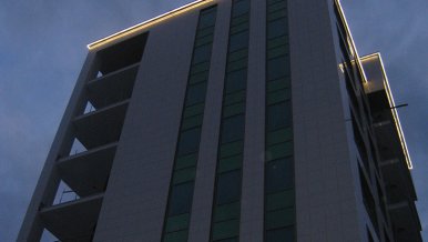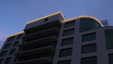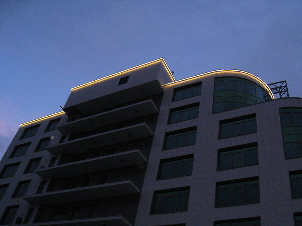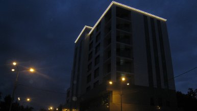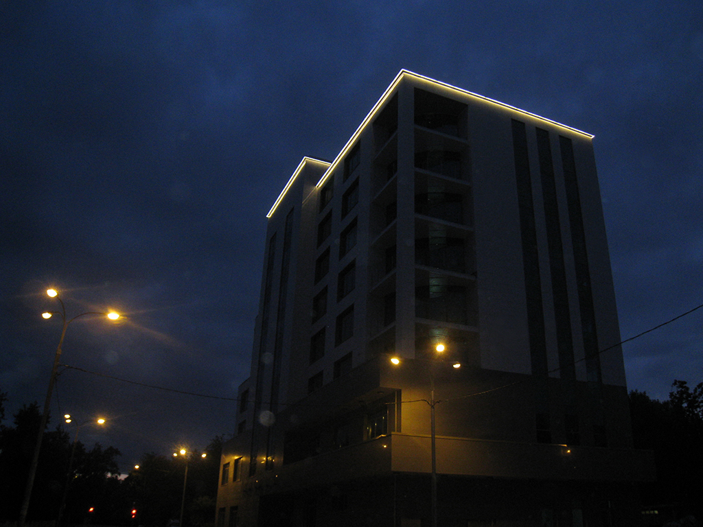 Our company carried out a project of facade illumination of a building near the TV center in the North-Eastern District of Moscow. LED lighting was installed on the roof of the building, along its perimeter and directed downward, illuminating its facade. To create a facade lighting used a powerful LED strip Arlight and installed in a wide aluminum profile.
