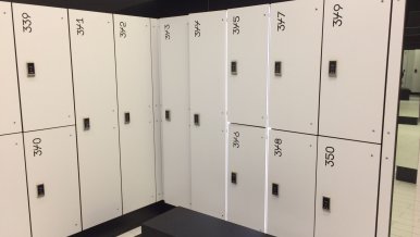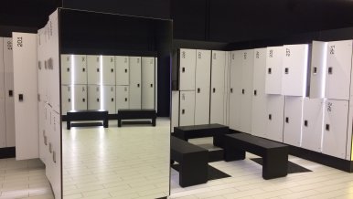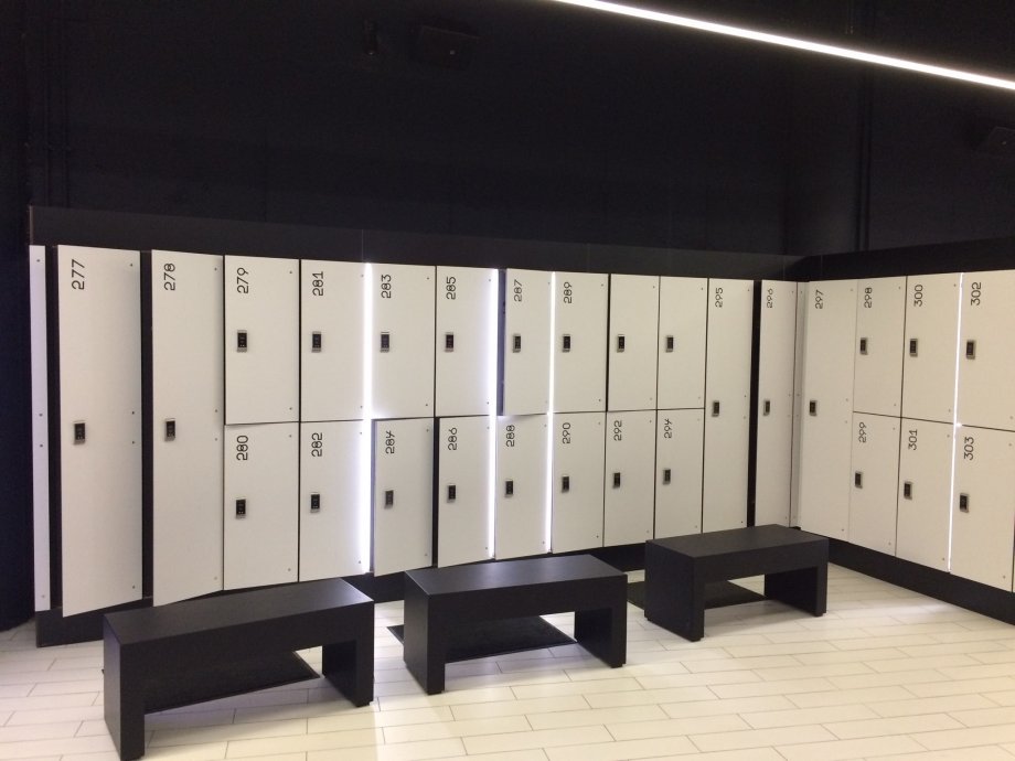 Two types of lighting were used to illuminate the locker room of the soccer club. The main lighting was provided by suspended linear luminaires based on aluminum profile. Vertical lighting of lockers was installed as additional decorative lighting.