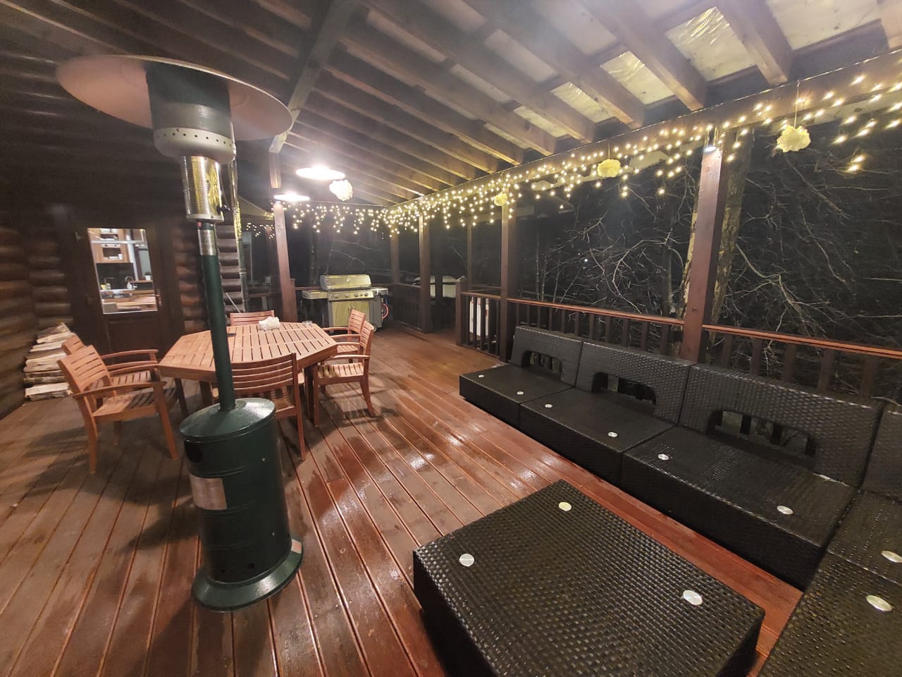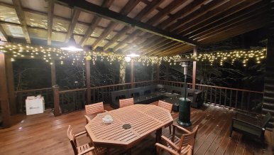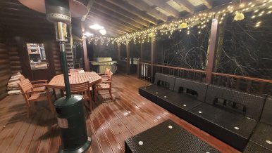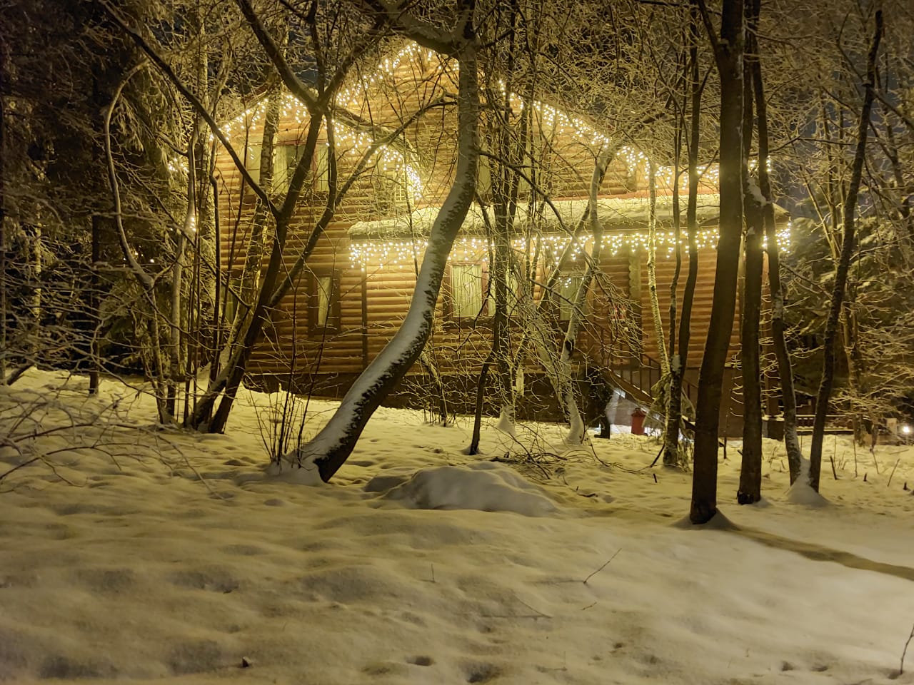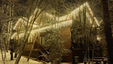 Create a fabulous and cozy atmosphere in the country house can be and in winter, using LED garlands. In this project it was enough to create lighting from the garland “fringe” around the entire perimeter of the roof to create a festive mood.
