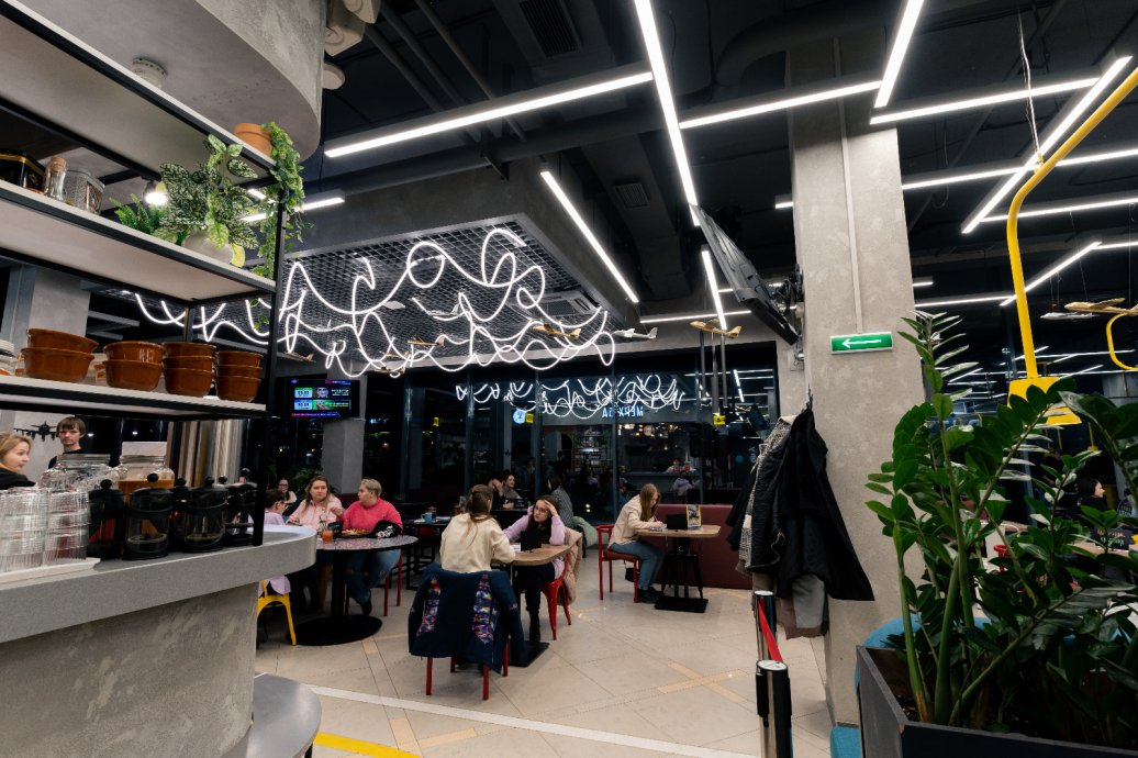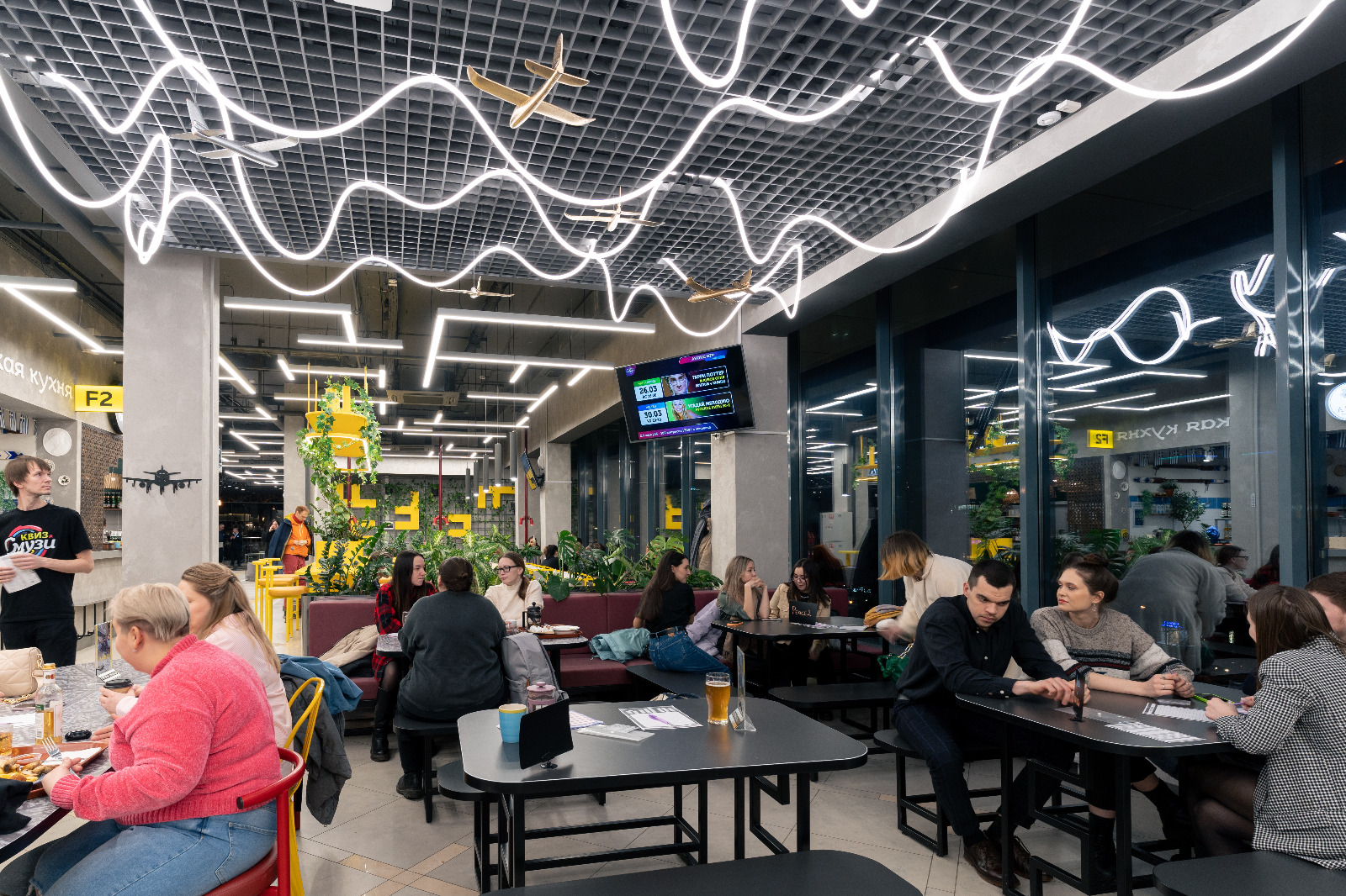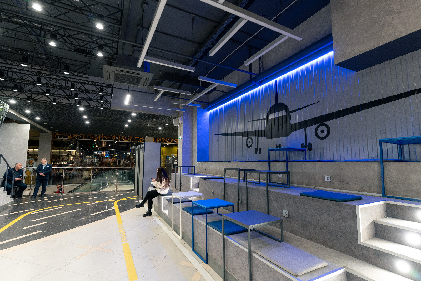 Stylish food court spaces can be used as photo zones. Separated by a yellow lattice screen, the cozy area attracts attention with contrasting yellow and blue colors, original chairs resembling luggage carts and bright neon lettering. Another interesting place is a two-level podium made in rich blue color with a light installation in the form of an airplane. The light design complements local interiors favorably, giving them a finished look.
