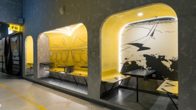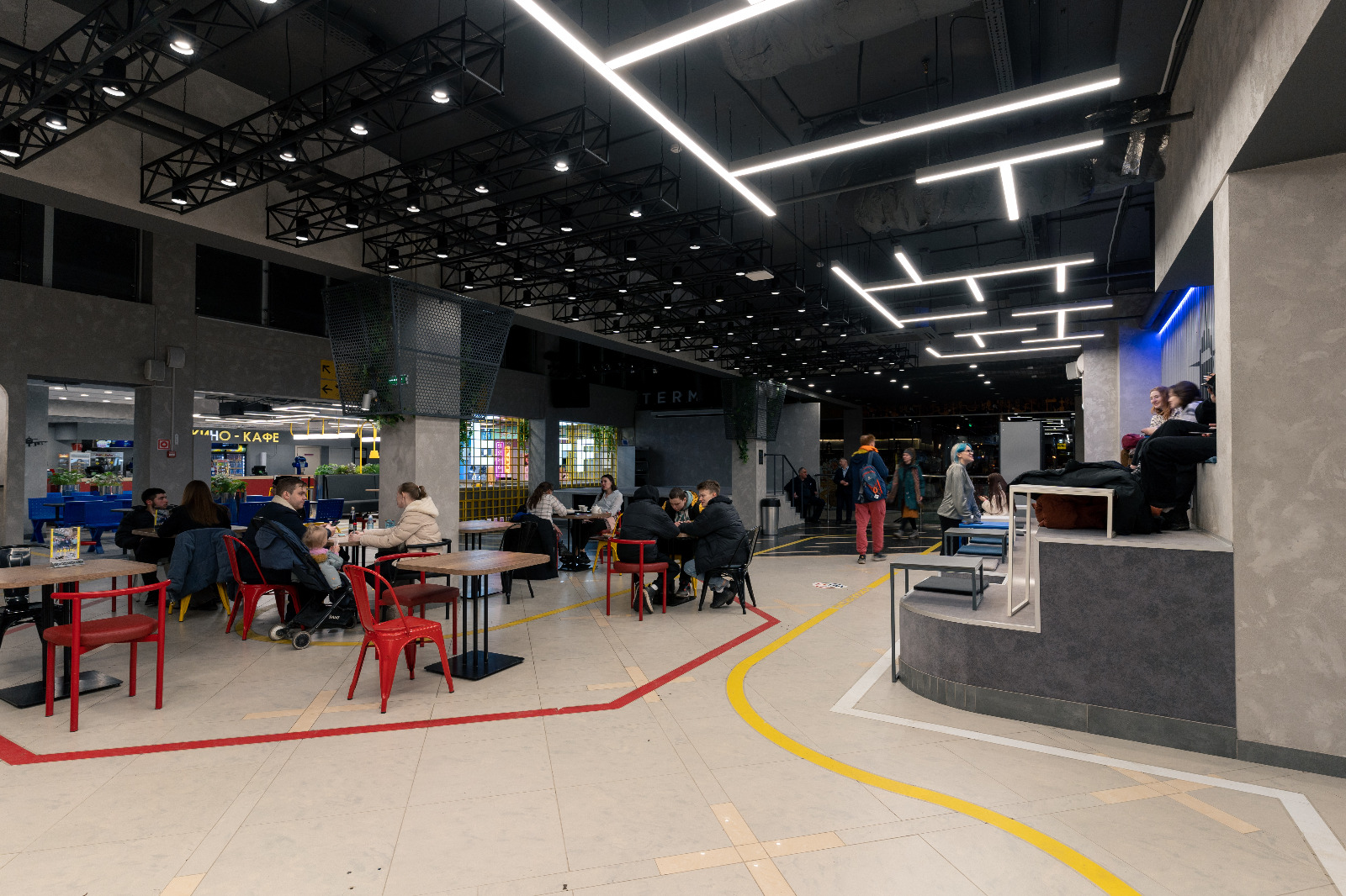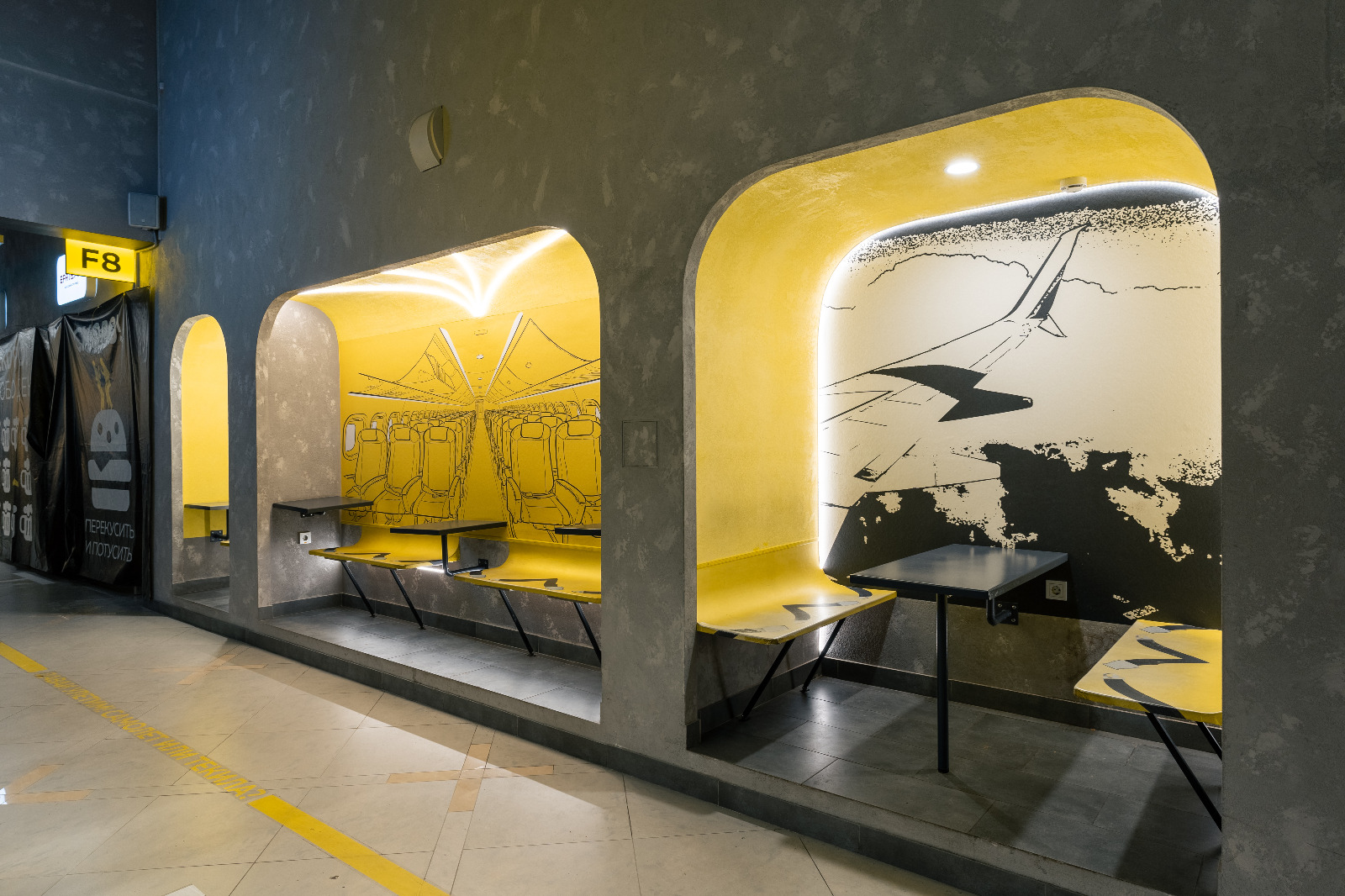 The design of the food court of the shopping center “Sigma” is made in the spirit of aviation romance. The designers tried to give the space a special atmosphere that reigns in airports, when time stands still in the streams of hurrying passengers. Many details refer visitors to air ports, airfields and airplanes. The floor markings are designed in the form of runways, the niches of the alcoves resemble an airplane cabin, and the walls are decorated with stylized views from portholes.