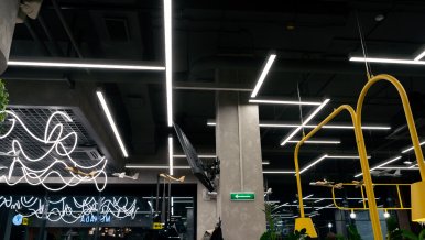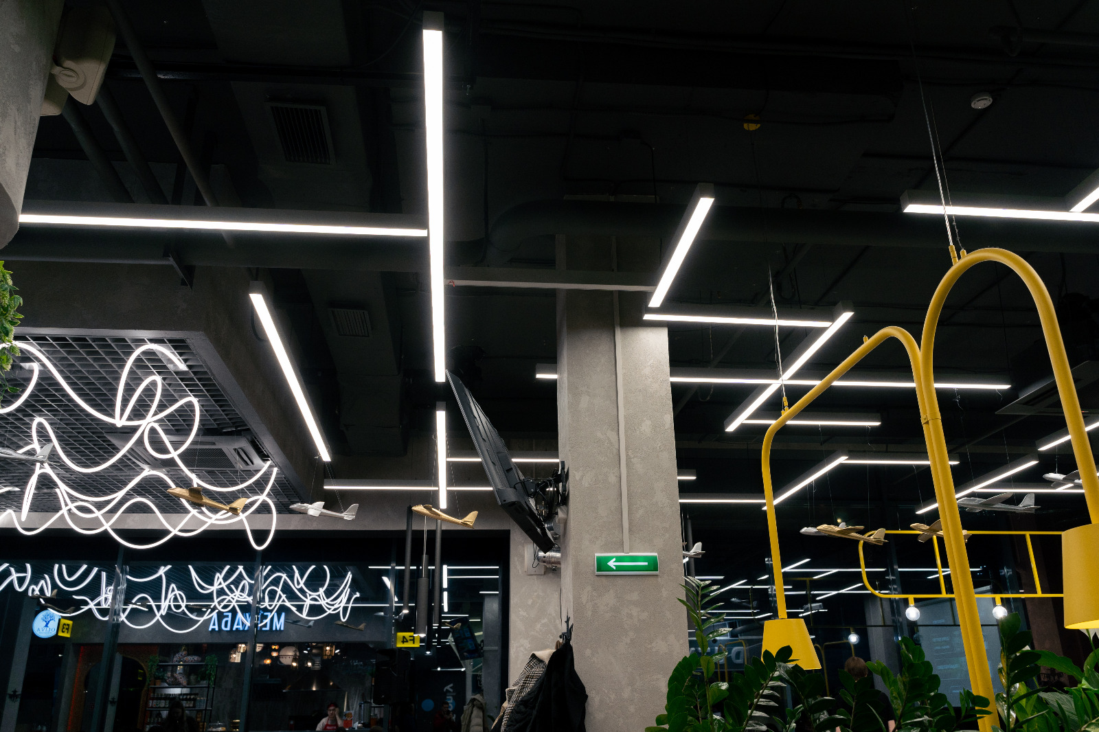While colored light is used for decorative lighting, neutral white 4,000 K was chosen for the main lighting. Daylight is invigorating, promotes concentration and reduces fatigue. Therefore, such lighting is most often used in airports. Perfectly suitable for lighting shopping centers.