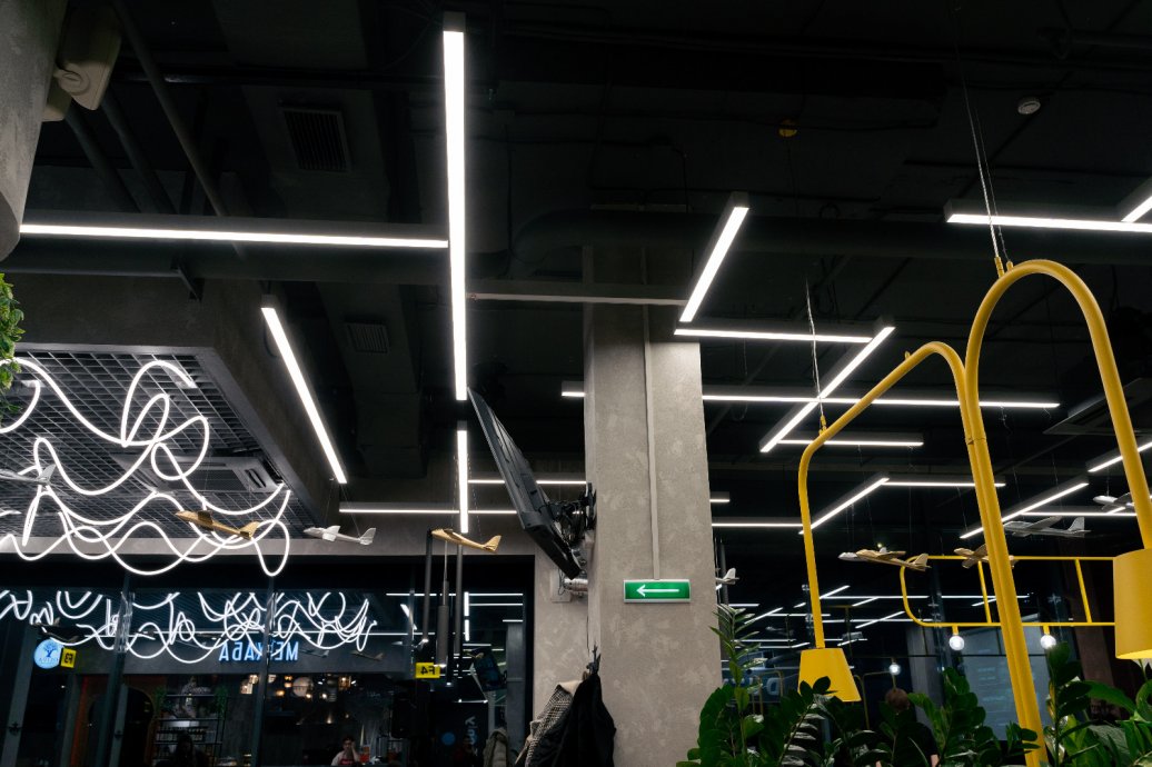 On the basis of LED strips of daylight shade of white and aluminum profile created suspended linear lights. And to soften the strict lines and add more light, created wavy installations of flexible neon, something reminiscent of clouds. Small models of airplanes, suspended from the ceiling, as if emerging from the stylized “clouds”, further enhance the resemblance to the sky.