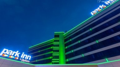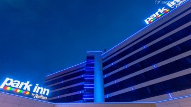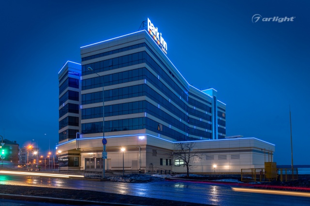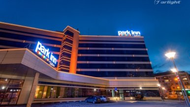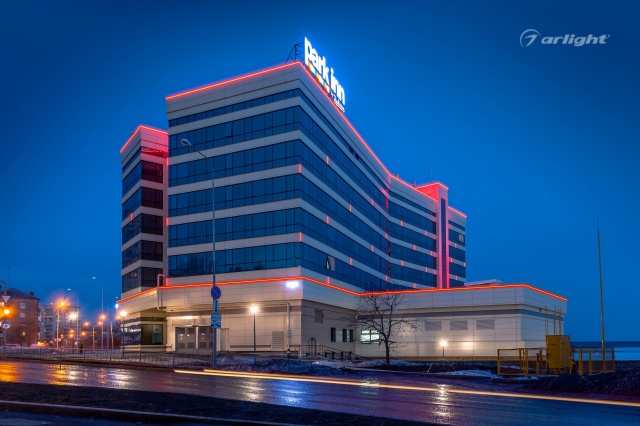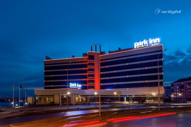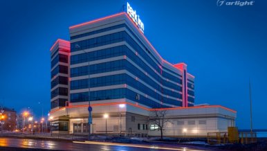 The geometric shapes of the Park Inn hotel building in Nizhny Tagil are emphasized by contoured backlighting. The backlighting is made of multicolor LED tape on the basis of an aluminum profile. The profile is covered with matte screens, which create a softer and diffused light.