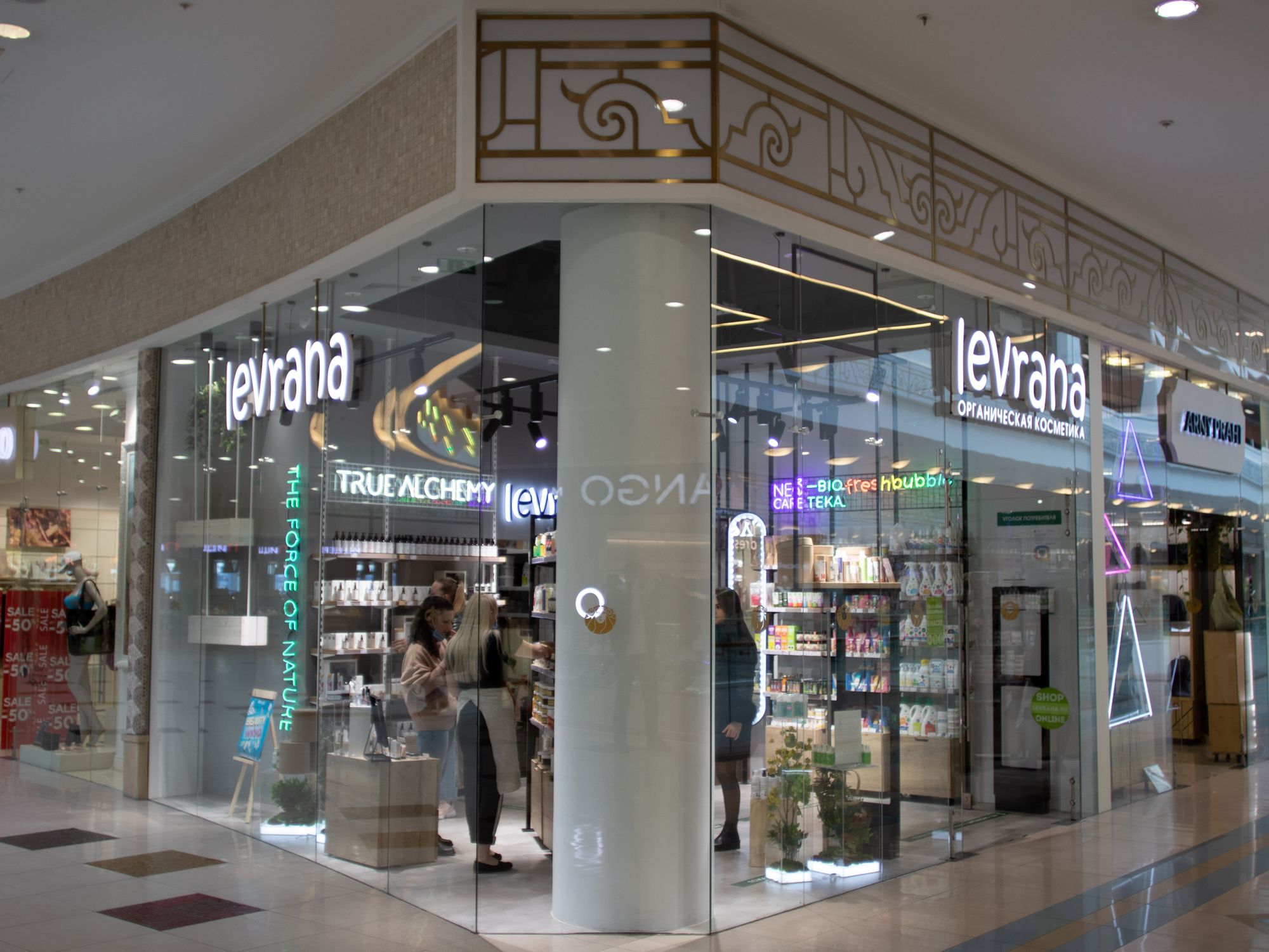 The lighting in the LERVANA cosmetics store is based on a three-phase track system placed around the perimeter of the store. This arrangement perfectly meets the purpose of lighting localized product groups located on the shelves along the walls.
