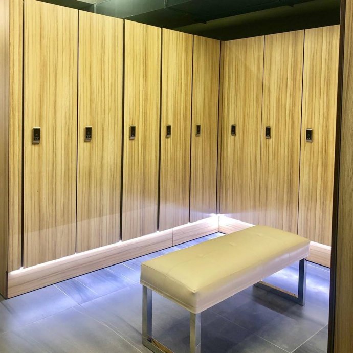 As the main lighting in the fitness club locker rooms, suspended luminaires made on the basis of aluminum profiles are used. Square and elongated rectangular luminaires illuminate the areas in front of the lockers according to their location. The light source is a cold-colored LED strip.