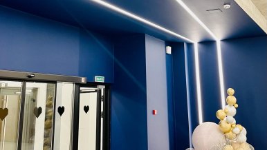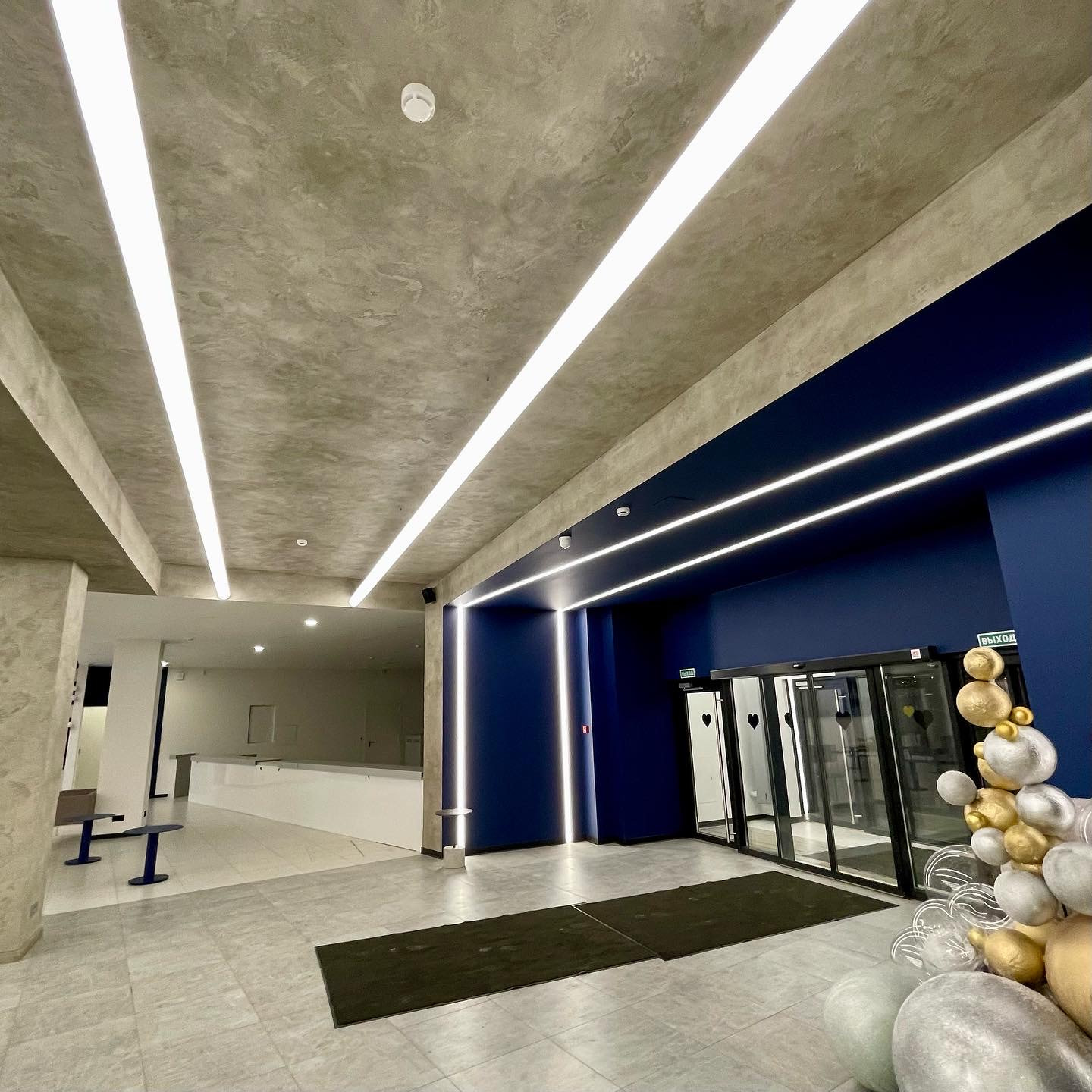 The chute and walls of the hall are decorated with wide light strips, which somewhere pass from one surface to another, and somewhere hang in the air.