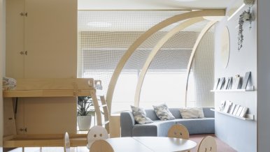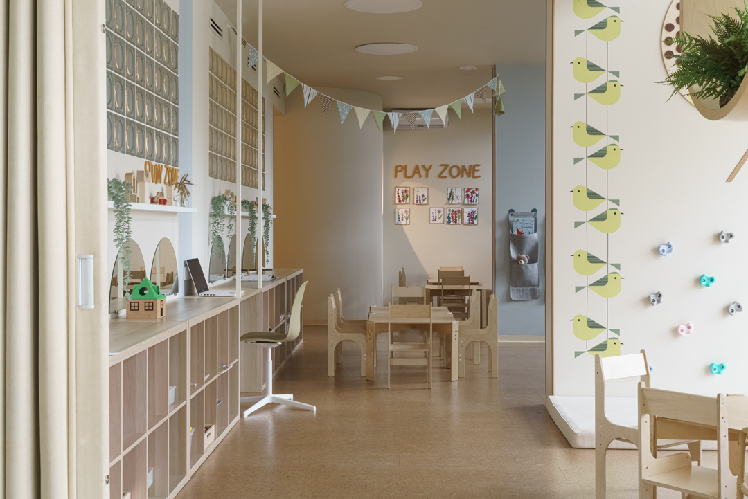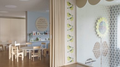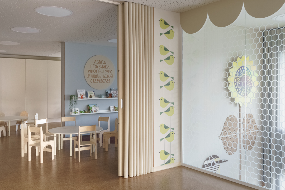 The interior of the kindergarten “Ovsyanki” is created with the orientation on child psychology and emotional component. The design is based on round, soft shapes. They are repeated in different elements that rhyme with each other. Bright “peas” on the walls, handmade models of planets of the solar system, rounded contours of furniture and mirrors, as well as natural light-brown color scheme, plenty of greenery and natural wood furniture - all this creates a comfortable atmosphere enveloping with coziness and joy. Such a pleasant environment helps to harmonize the psycho-emotional state of children.