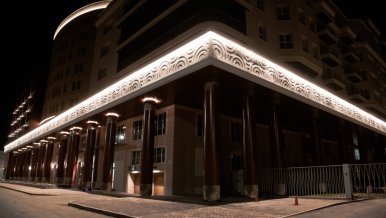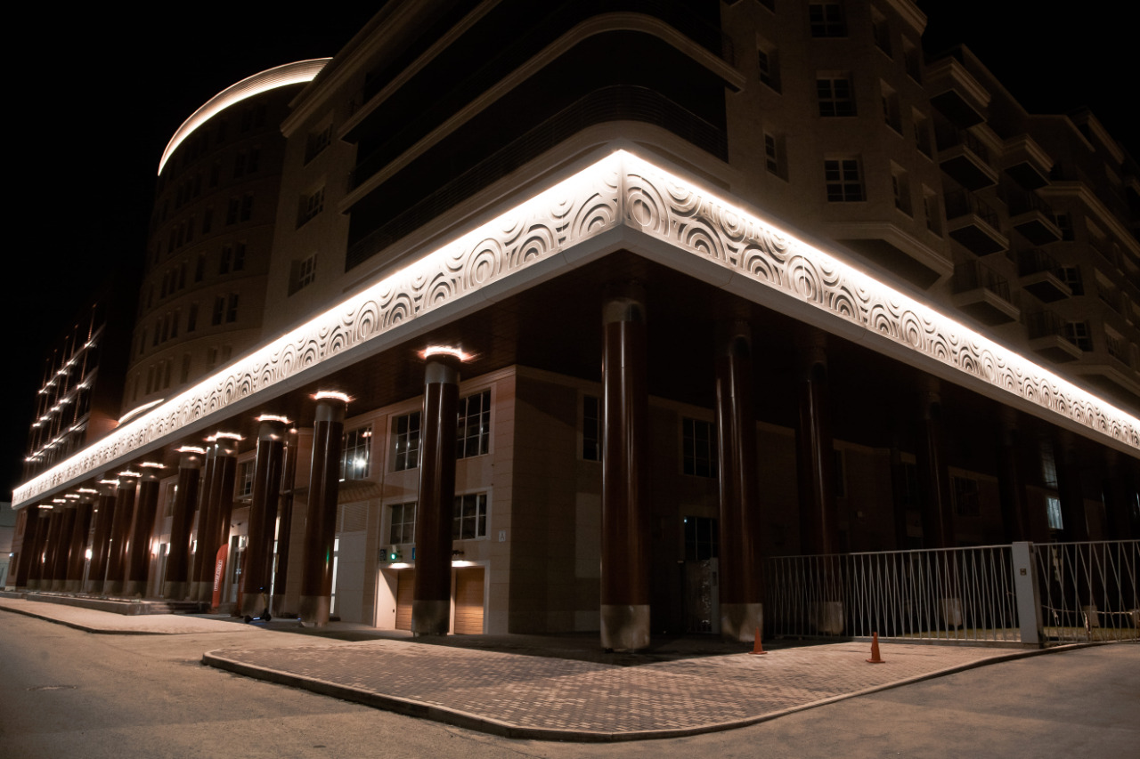 Particular expressiveness of the complex of buildings at night is given by the backlighting, made on the basis of sealed tape ARL PV C72. Warm shade of luminescence (3 000 K) creates a cozy atmosphere, harmoniously emphasizes the classical elements of decor, gives additional volume to relief surfaces. On one of the buildings, the illumination is organized along the upper and lower contours in wide strips that emphasize the monumentality and premium nature of the building.