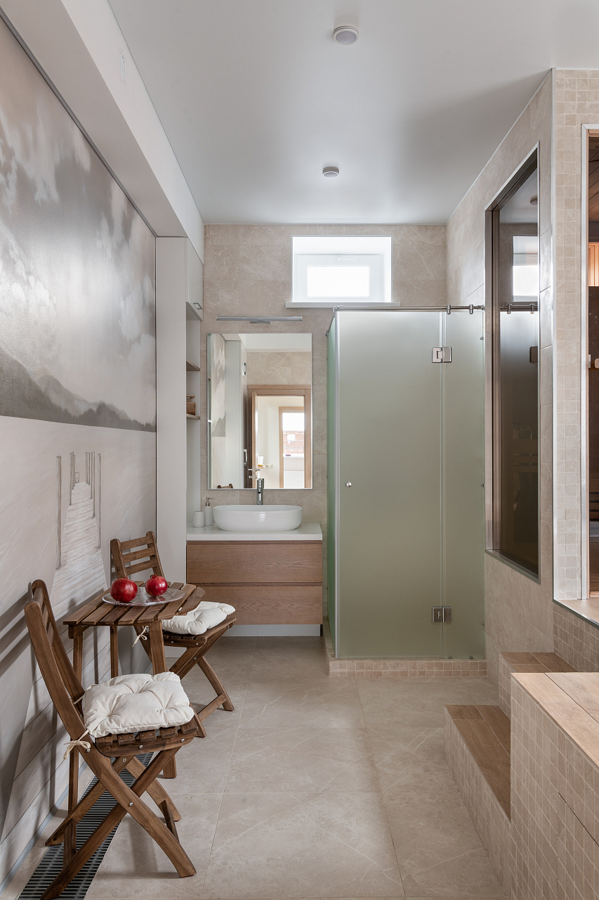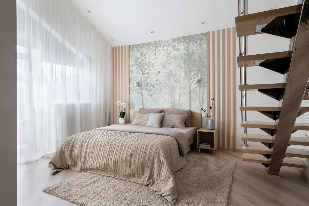 The interior of a private house in Moscow is made in calm and natural colors. Lighting throughout the house rather gently creates the necessary background, rather than playing a key role. In most rooms, the main lighting is solved at the expense of built-in fixtures of warm white light merging with the ceiling. In the bedrooms, swivel models are used, which allows you to change the direction of light.