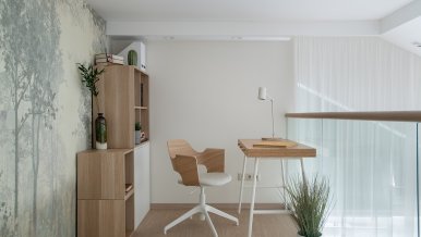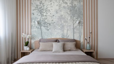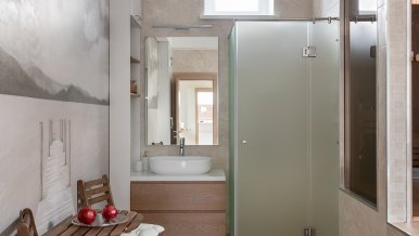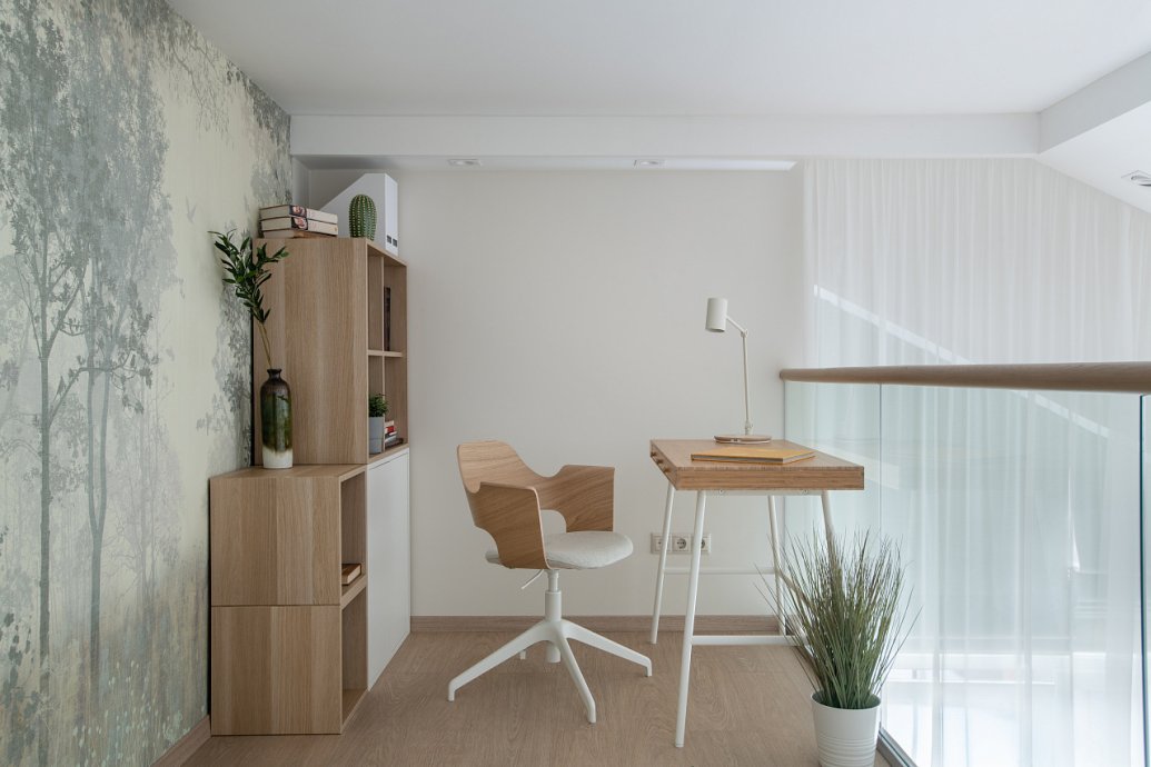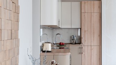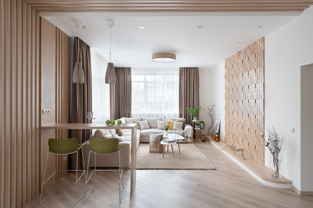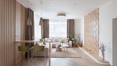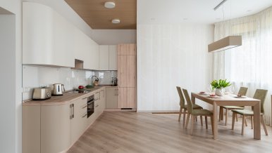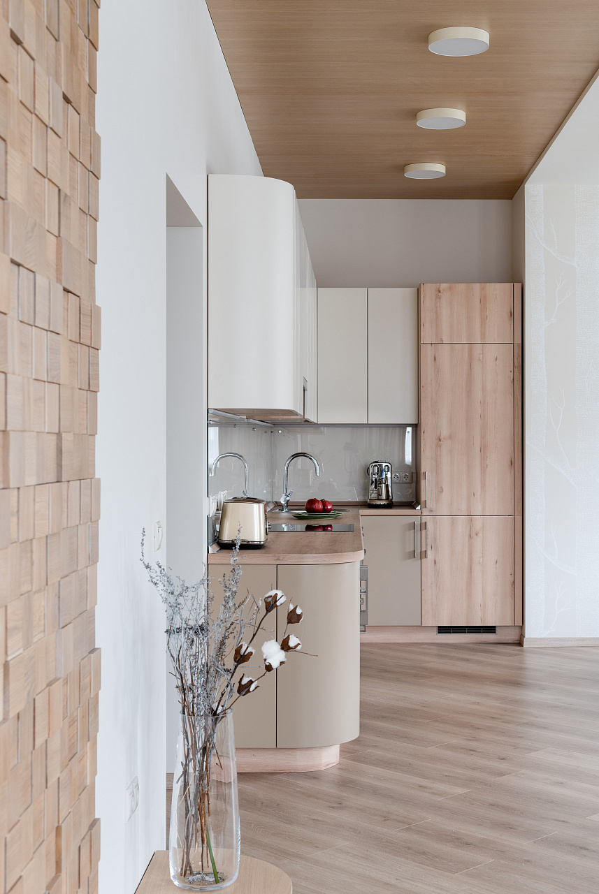 In the living room, built-in ceiling lights are decorated with a glass frame. In the kitchen area the role of the main lighting is performed by round surface-mounted luminaires with a body imitating wood. Also in the kitchen is implemented illumination of the working area on the basis of aluminum profile and LED tape.