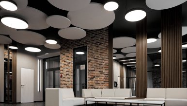 In the lobby of the children's center, white luminaires of different sizes RONDO rhyme with round decorative panels on the ceiling, creating a light, relaxed atmosphere so suitable for children's spaces. Thanks to the opal screen, which softly diffuses the light, a comfortable glow is created.