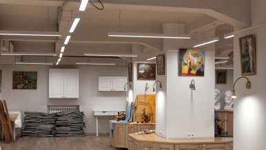 In the folk studio of fine arts named after Y. K. Kiselev the same linear pendant lights are used, but in white color. They seem to continue the theme of overlapping ceilings, but thanks to the white color do not overload the interior.