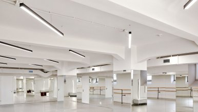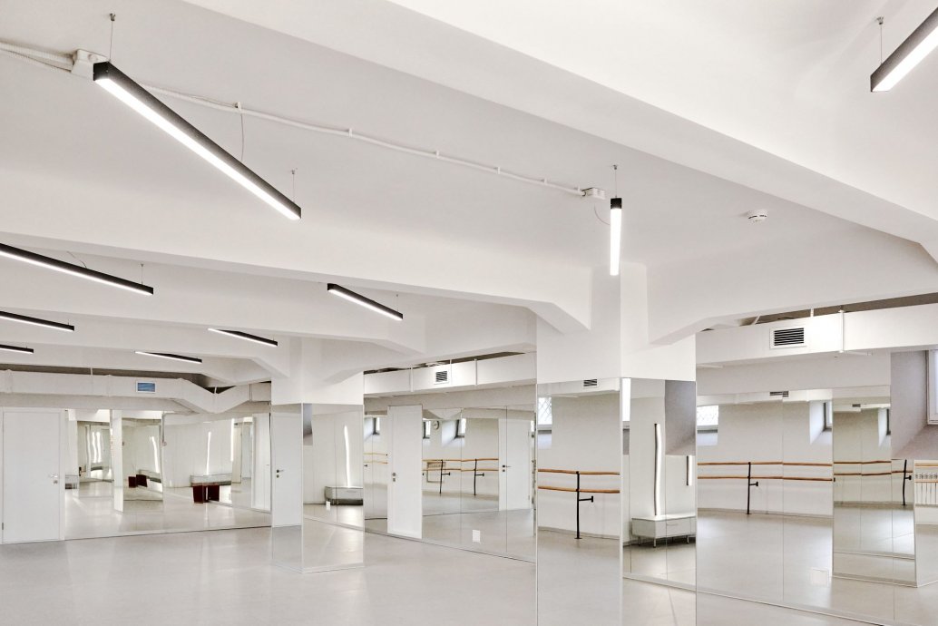 The dance studio is equipped with linear profile luminaires with a suspended mounting method. The matte screen softens the light flux from bright LEDs, which creates a uniformly illuminated space without blinding effect, convenient for dance classes.