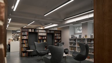 In the library, suspended luminaires based on LED strips and SL LINE profiles balance the ceiling slabs. In a stylish black color, they create a clear geometry. TOR PILL PRISM round luminaires bring playful motifs into the interior, bringing back the idea that the space is organized for children.